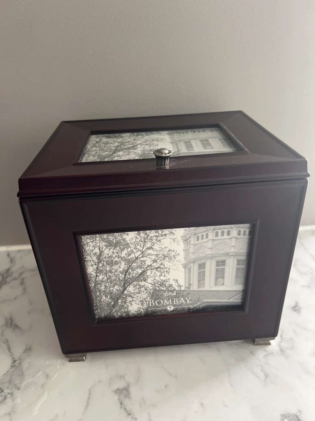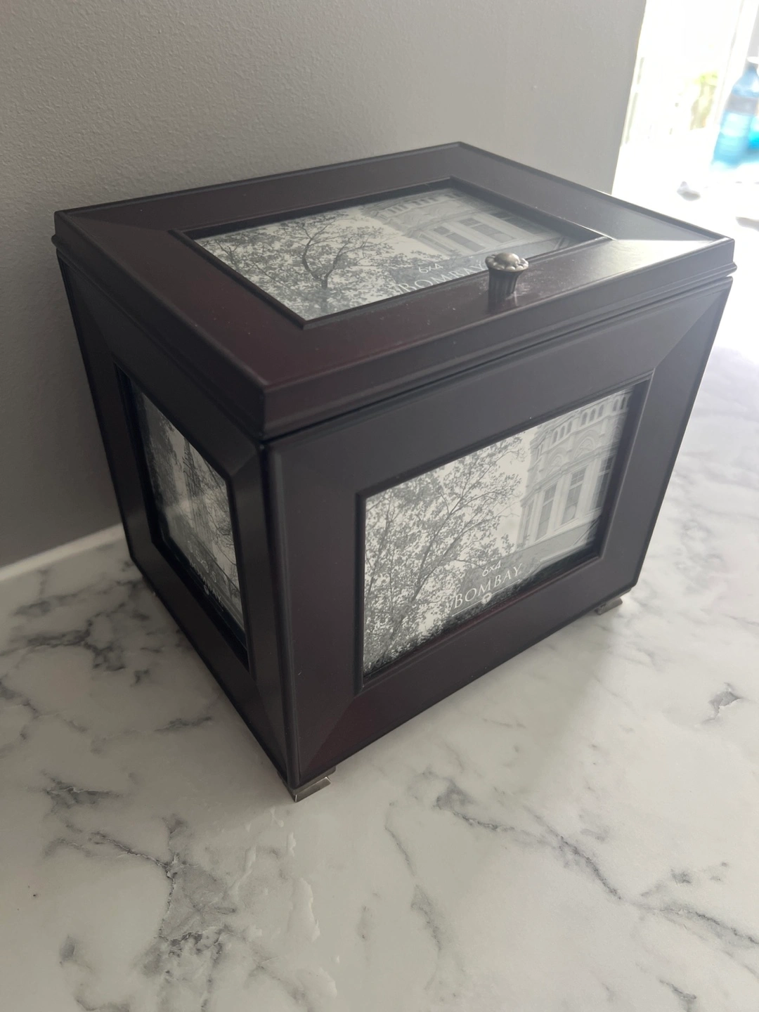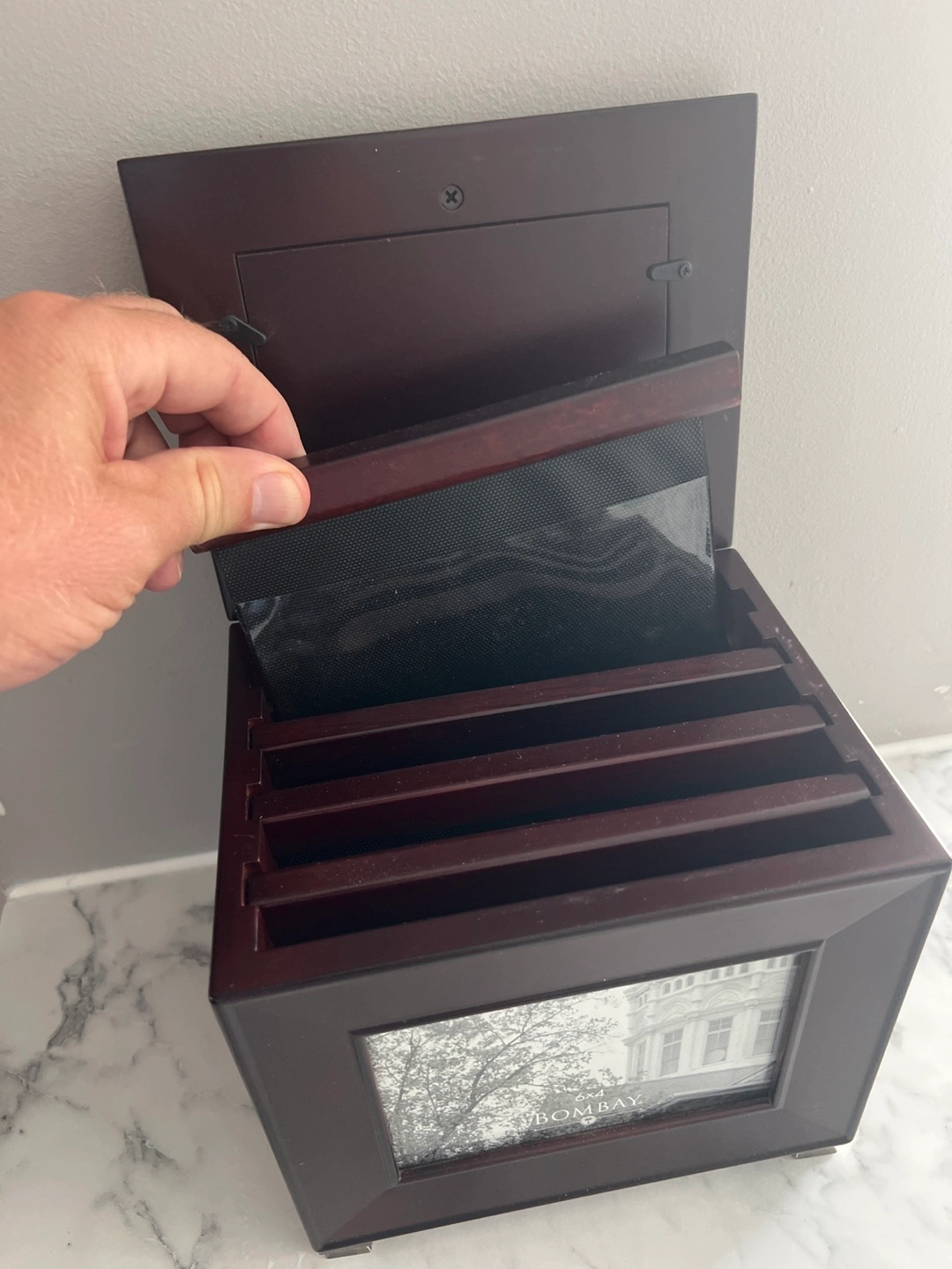 Here's a lovely Bombay photo storage box! It's perfect for keeping your precious memories safe and organized. The box has slots for multiple photos and a nice dark wood finish.