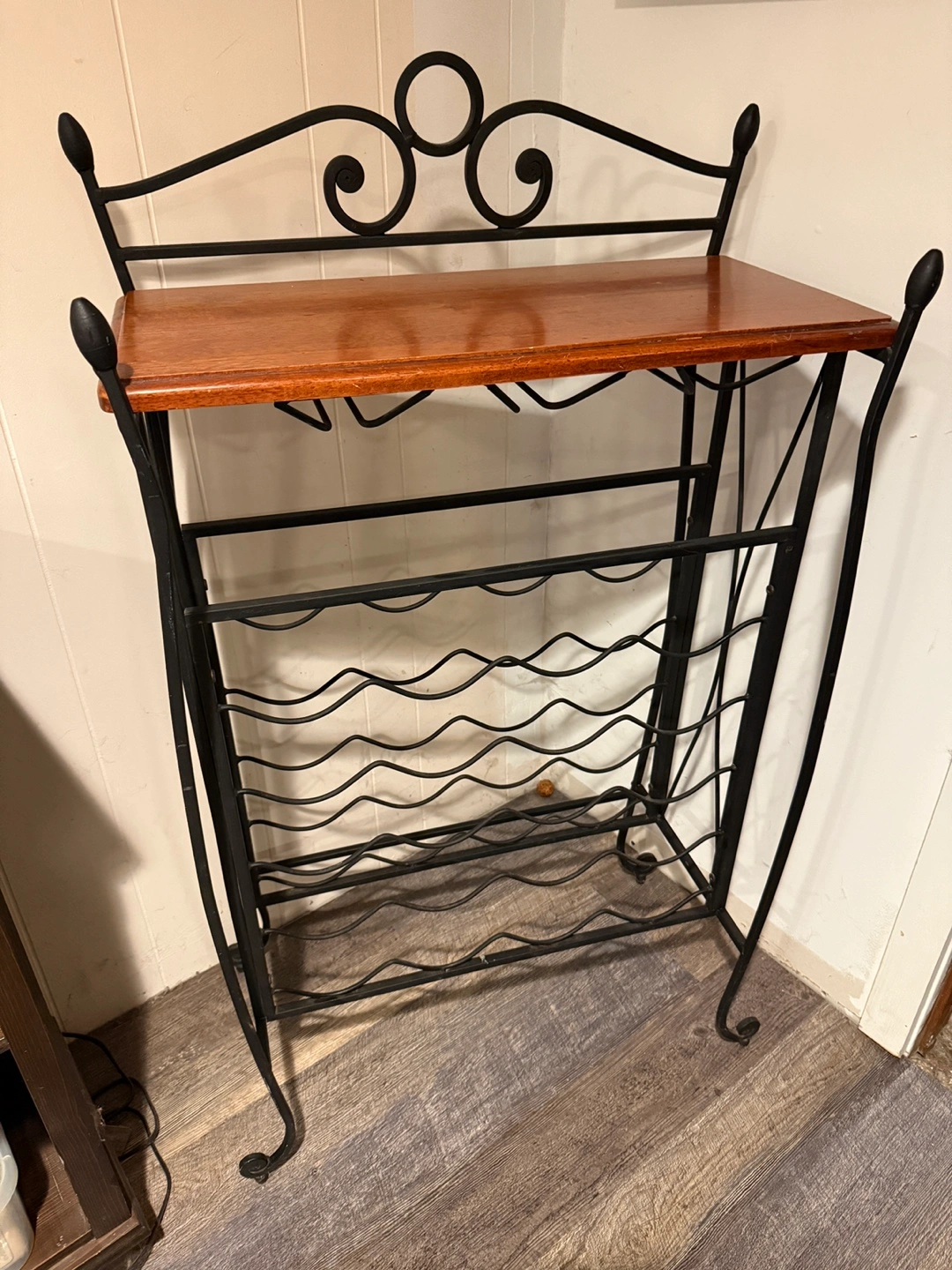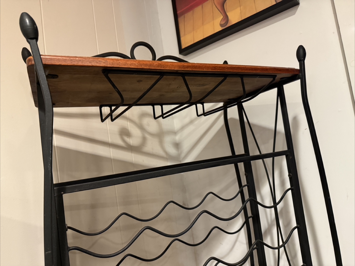 Selling a wine rack with a wooden top and wrought iron frame. It's perfect for storing your wine bottles and glasses.