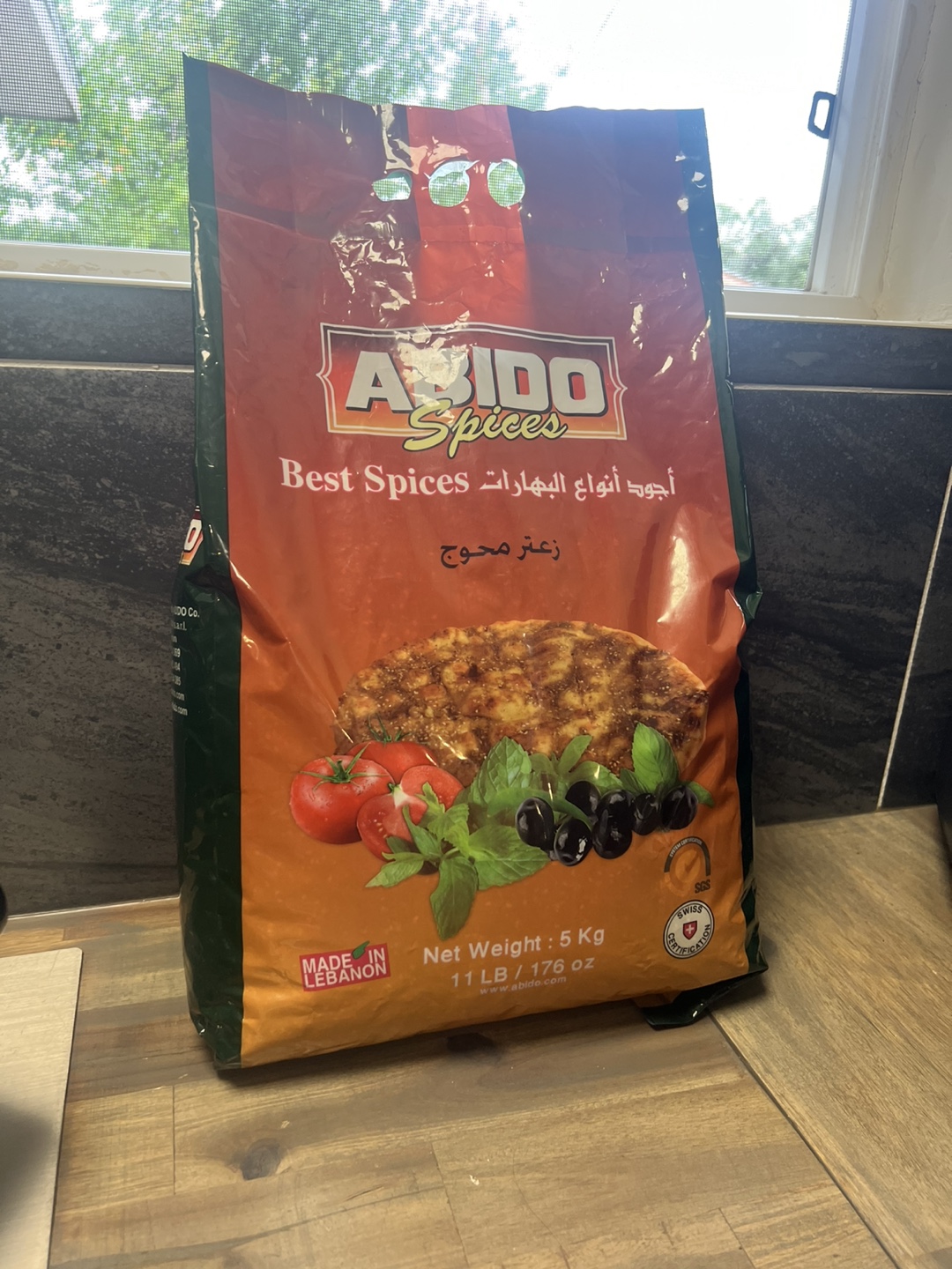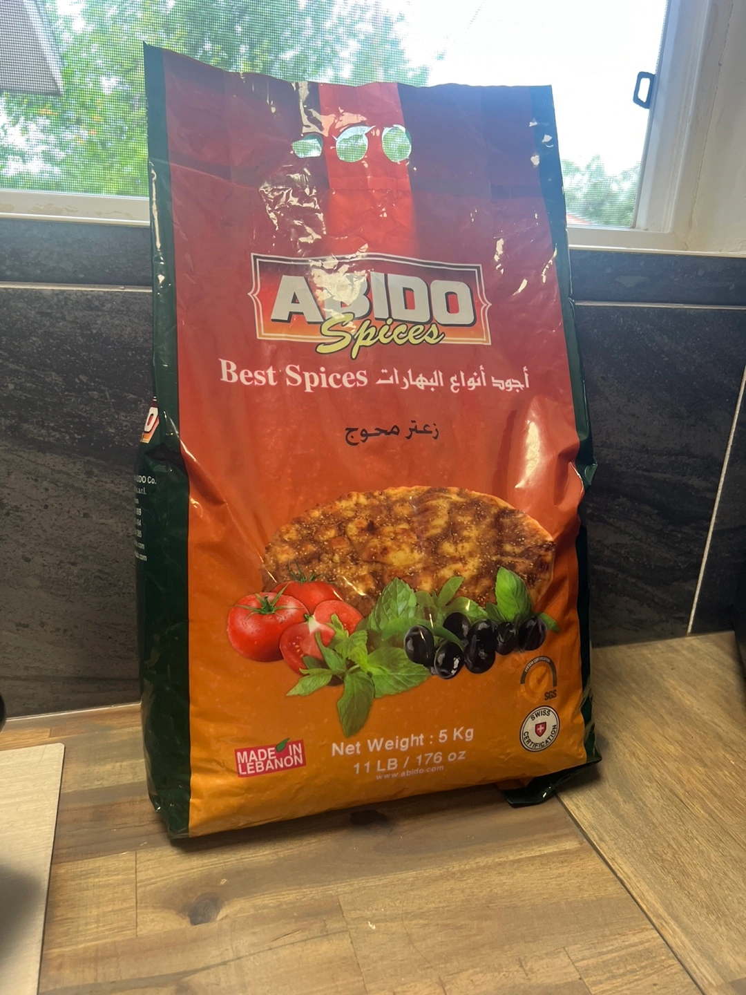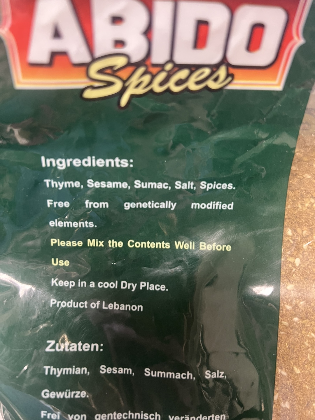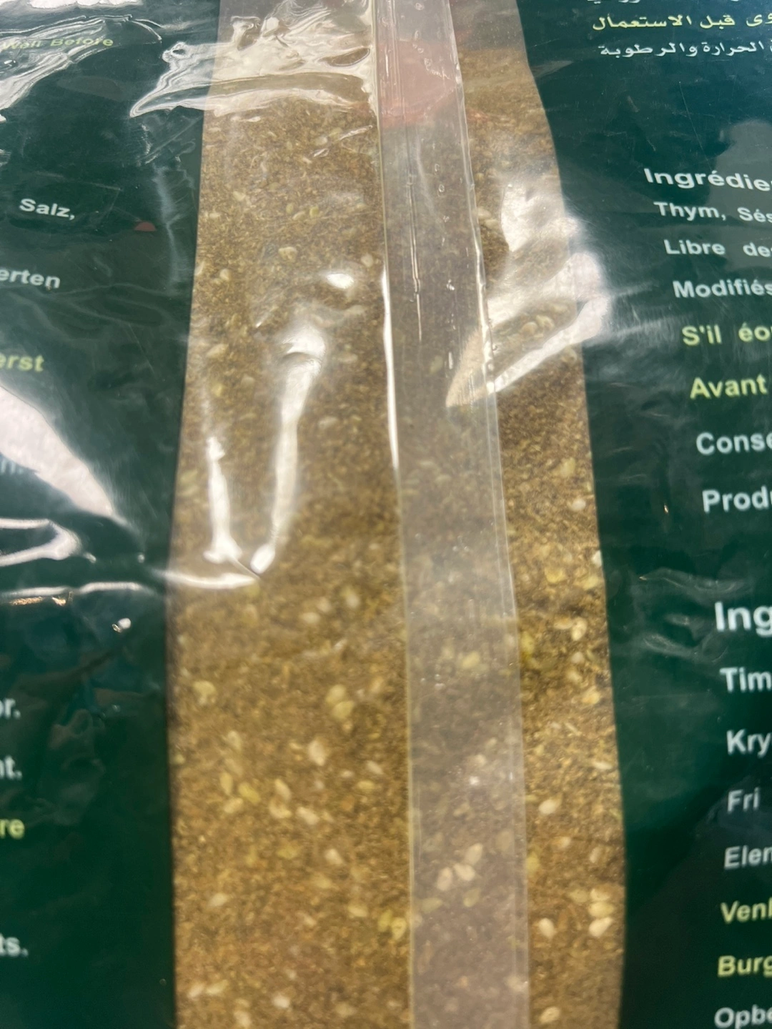 Product of Lebanon. Good luck finding anywhere! The ingredients include thyme (Zaatar), sesame, sumac, salt, and spices It's a fundamental pillar in Middle Eastern cuisine, often used in various dishes like Manakish (as shown on the bag) and other savory recipes. Just like at your local Lebanese bakery! Add some virgin olive oil to it, mix, slather on pita or any bread of choice, bake, and you have the yummiest “Zaatar” ever! And NEVER expires if sealed well. Selling extra virgin oil, as well.