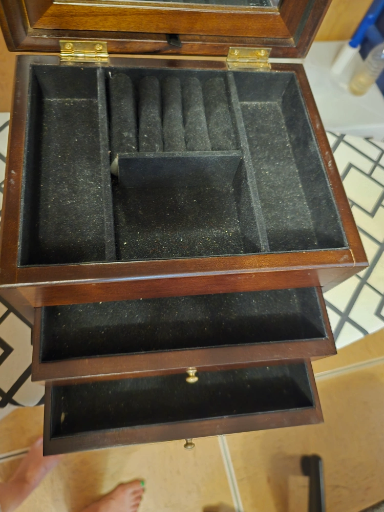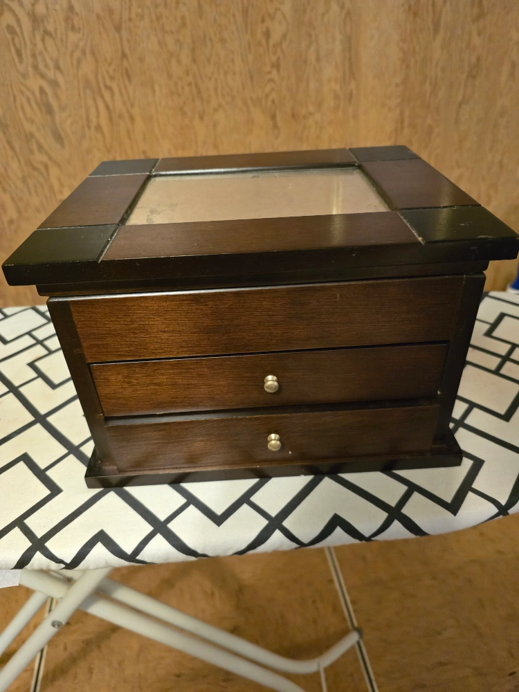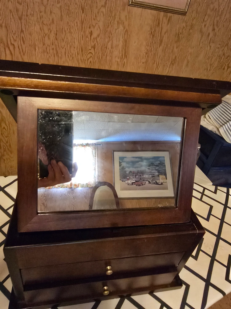 Here's a lovely wooden jewelry box with a mirror and drawers. It's perfect for keeping your jewelry organized and safe. It's in great condition and ready for a new home