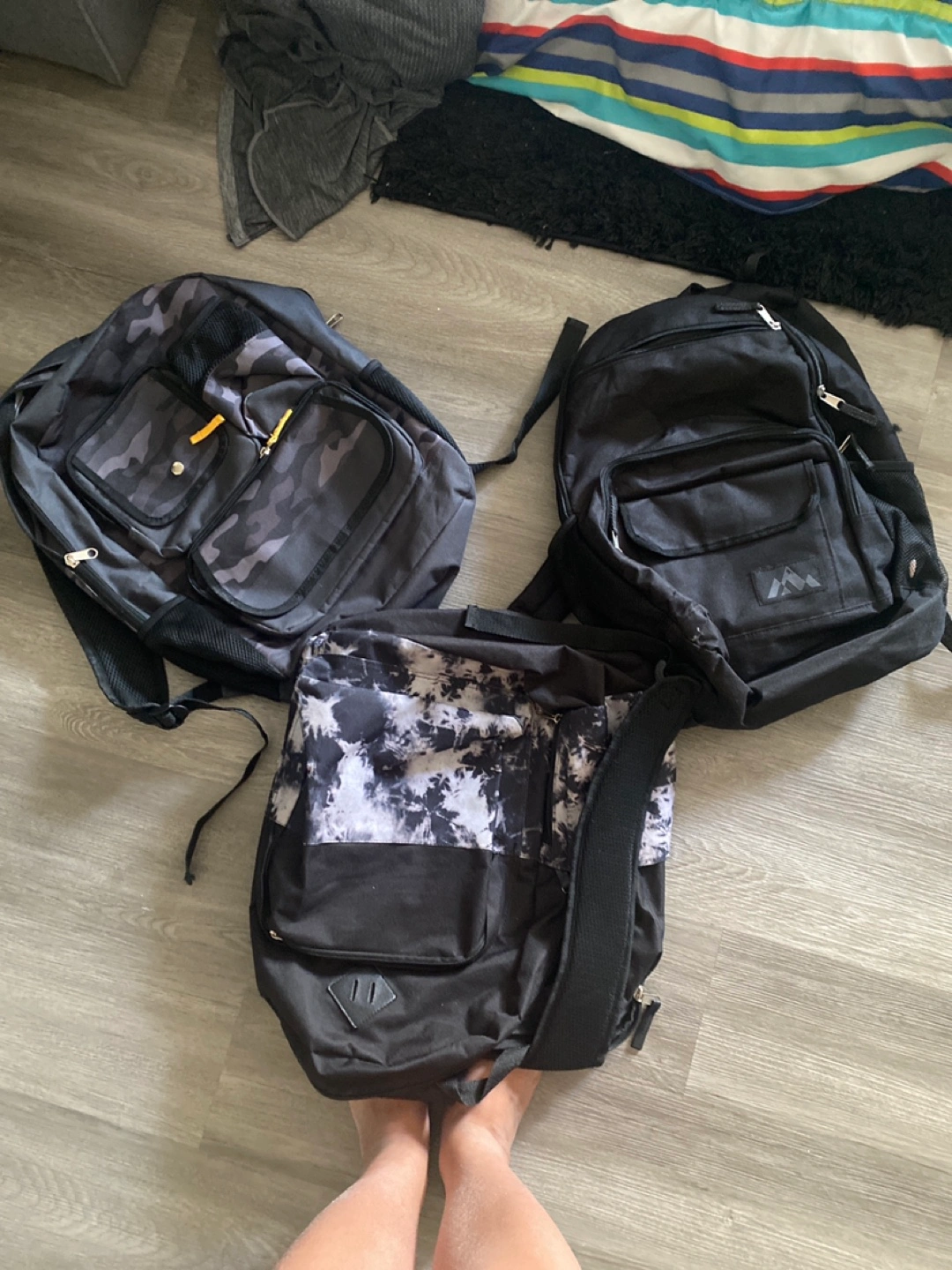 FREE three backpacks in good condition! There's a camo one, a plain black one with a mountain logo, and a black and white patterned one. Great for school, work, or travel