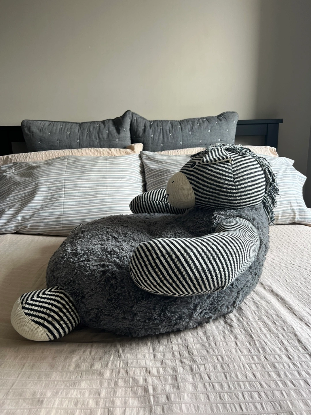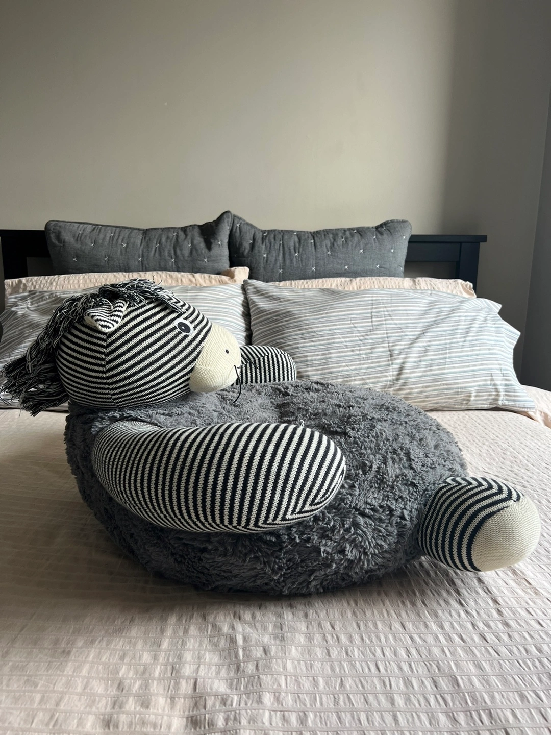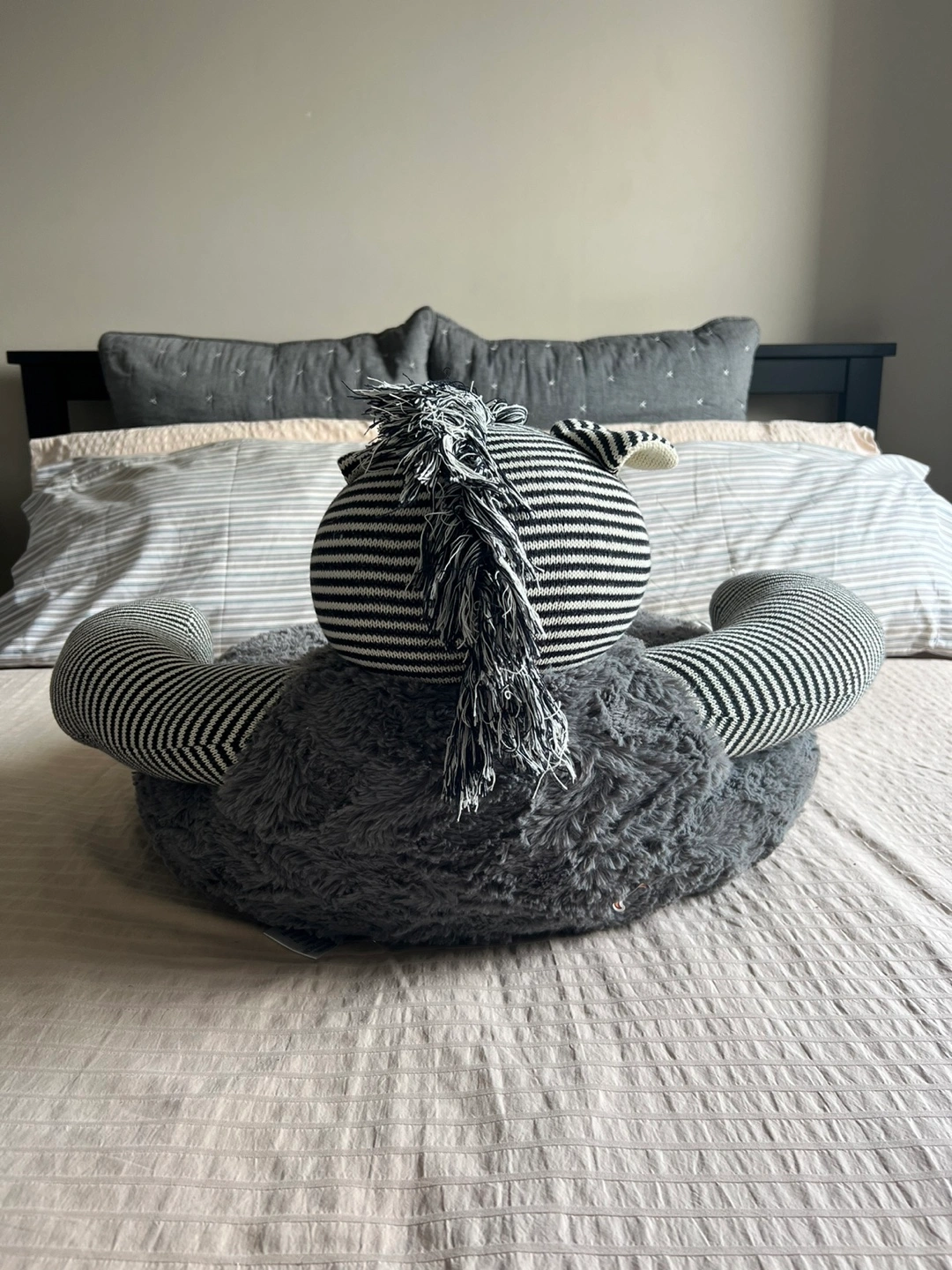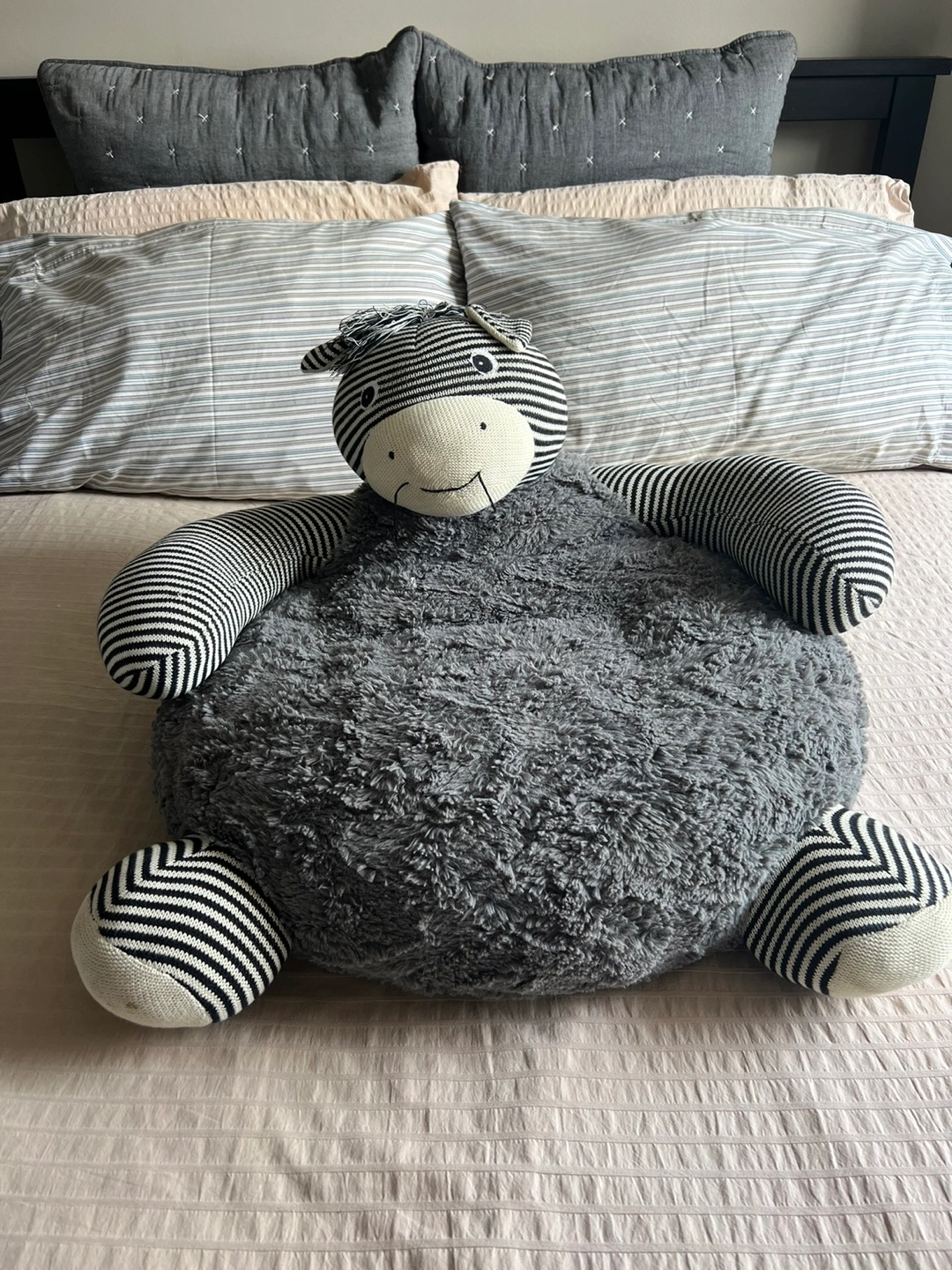 Selling a cute zebra plush pillow! It's in great condition and would be perfect for a kid's room or as a decorative piece. The zebra has a soft, fluffy body and striped arms and legs. It's super cuddly!