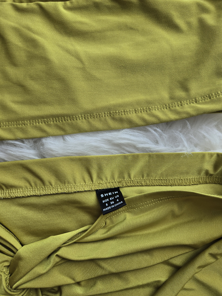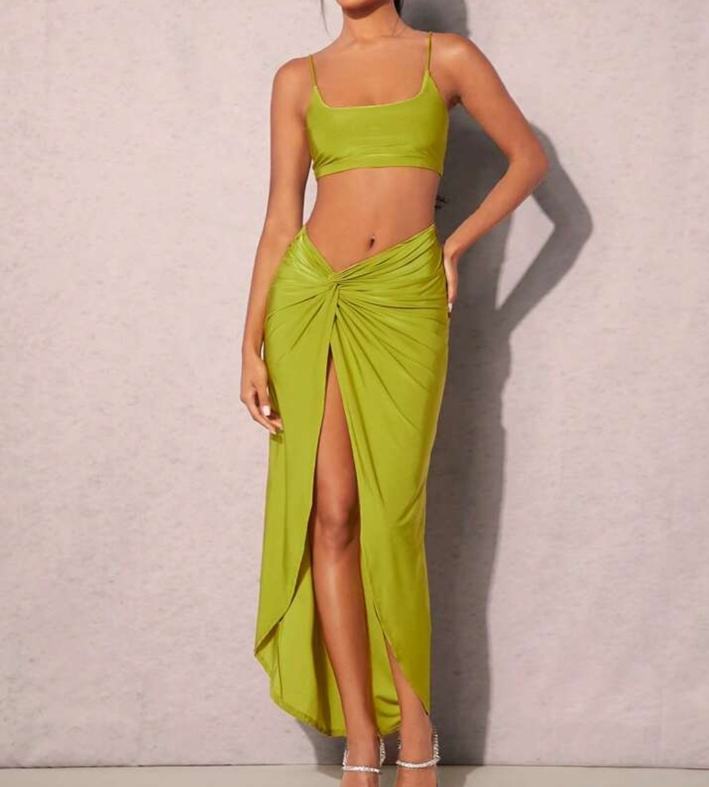 Shein two-piece set in a vibrant green colour! The set includes a crop top and a skirt with a stylish knot detail. Size US 4. Perfect for a fun night out or a summer day!