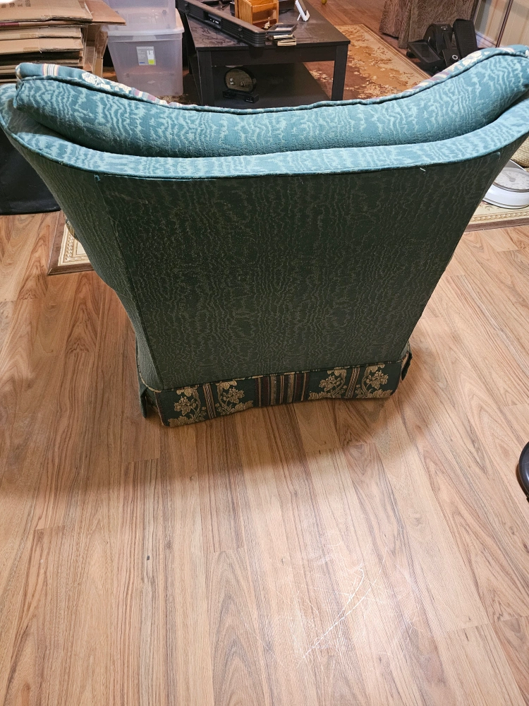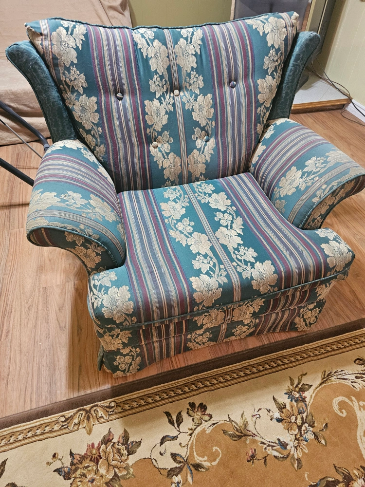 Selling a comfy sofa and matching armchair! They feature a unique floral and striped pattern in shades of green and burgundy. Perfect for adding a touch of vintage charm to your living room or den. They're in good condition and ready for a new home!