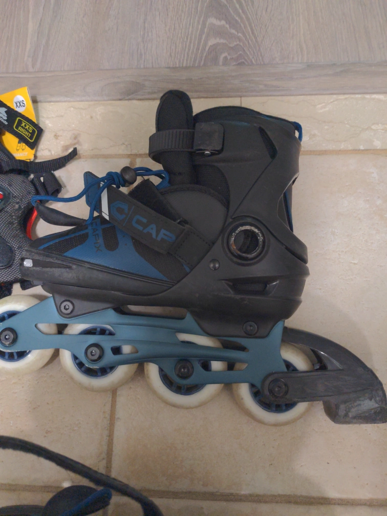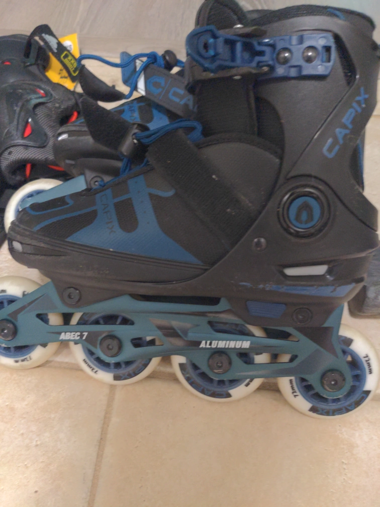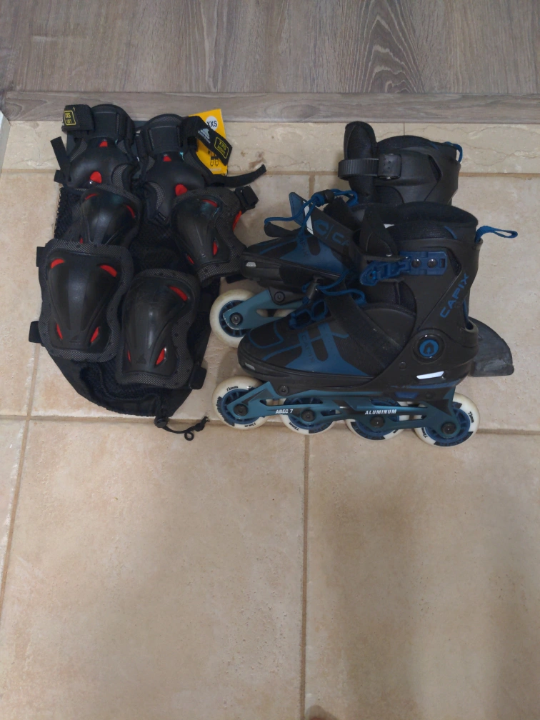 80Selling a pair of adjustable Capix size 1-4 inline skates, perfect for cruising around town! They come with a full set of xxs protective gear, including knee pads, elbow pads, and wrist guards. They are in good used condition and ready for a new owner! Can throw in a second set of xxs pads for free. Open to offers.