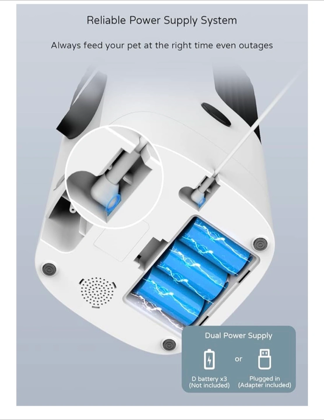 I'm selling an automatic pet feeder for cats and dogs! It's a programmable pet food dispenser with a 4L capacity. It can be powered by plug-in or batteries. This dispenser features precision feeding program and portion control, allowing 1-4 meals per day. It also has a 10s voice recorder so you can call your pet to eat!
