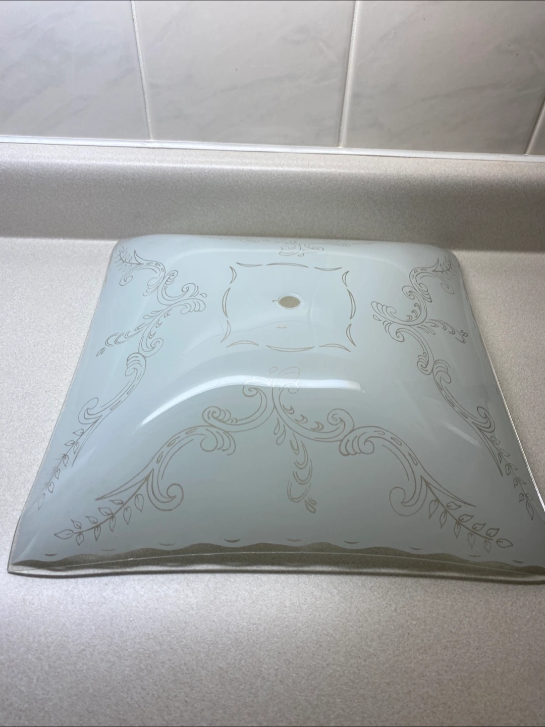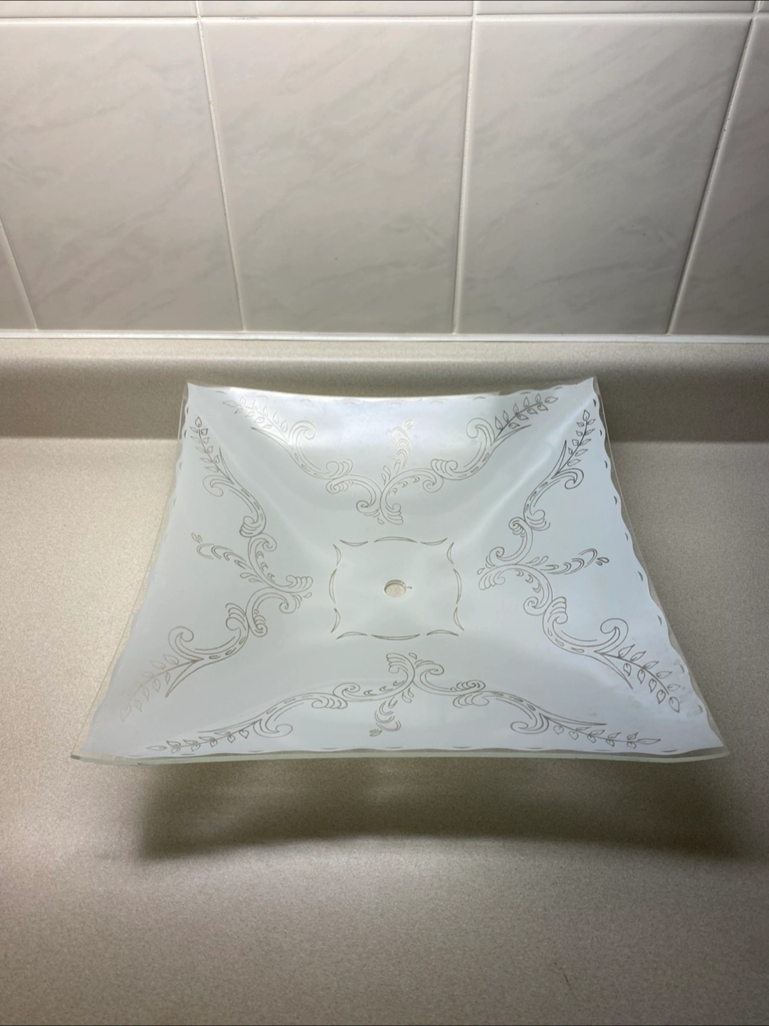 Selling a square ceiling light cover. It has a frosted glass appearance with a decorative design. Perfect for adding a touch of elegance to any room!
