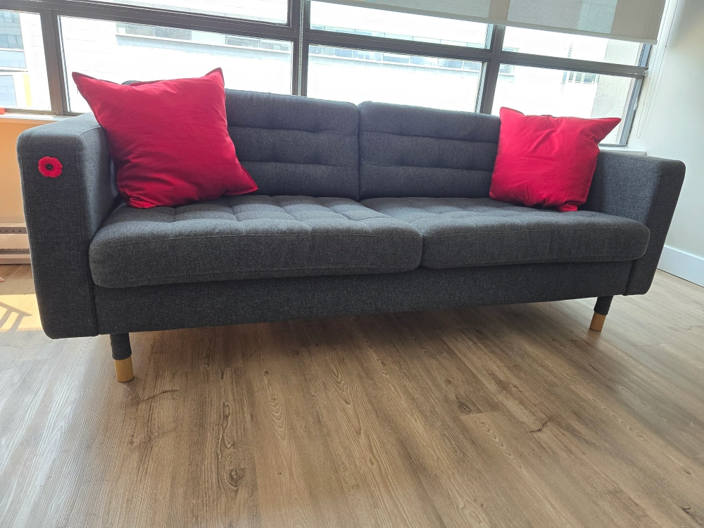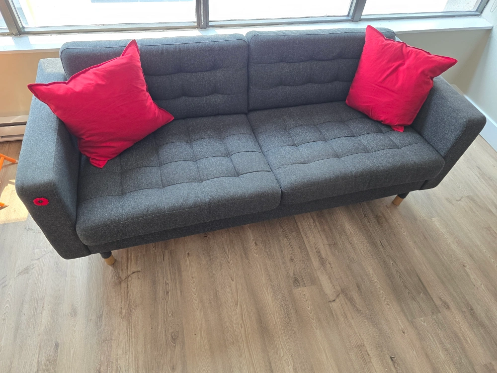 Selling a comfy grey two-seat sofa. It's in great shape and would be perfect for a small apartment or living room. The cushions are nice and firm, and it's a great spot to relax after a long day