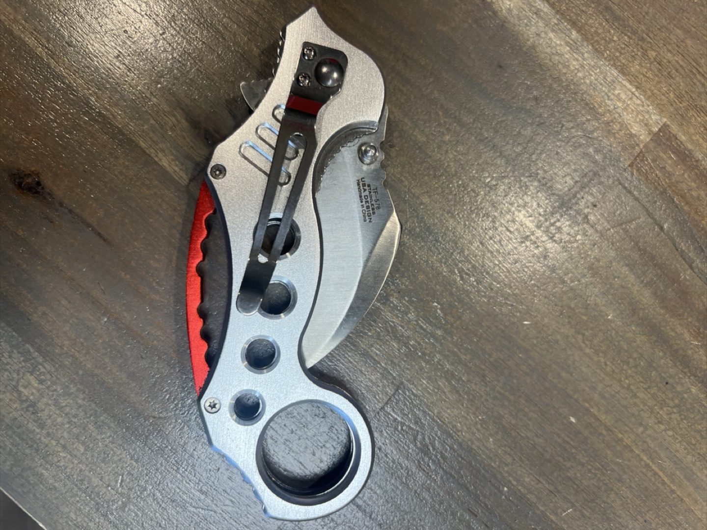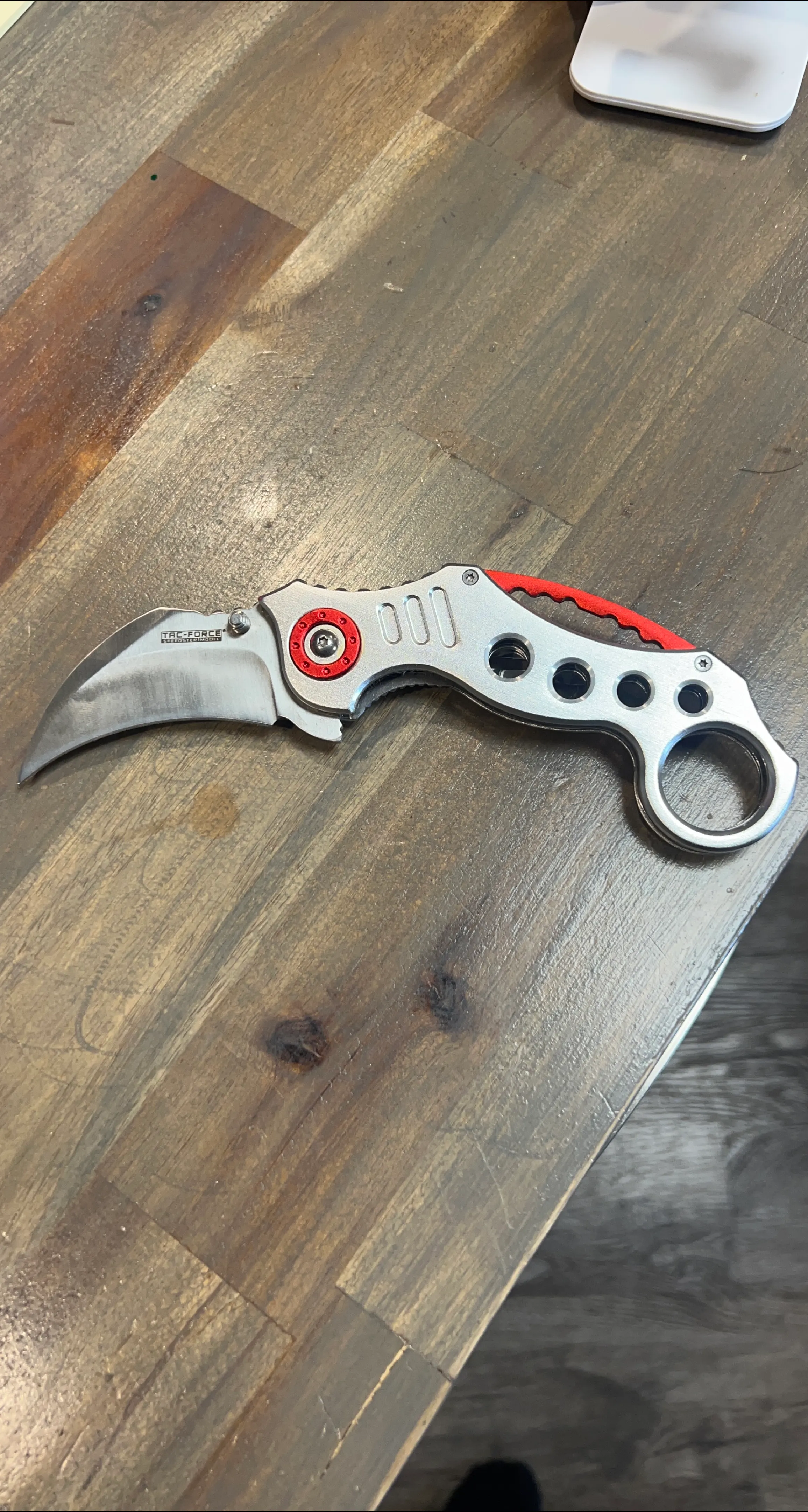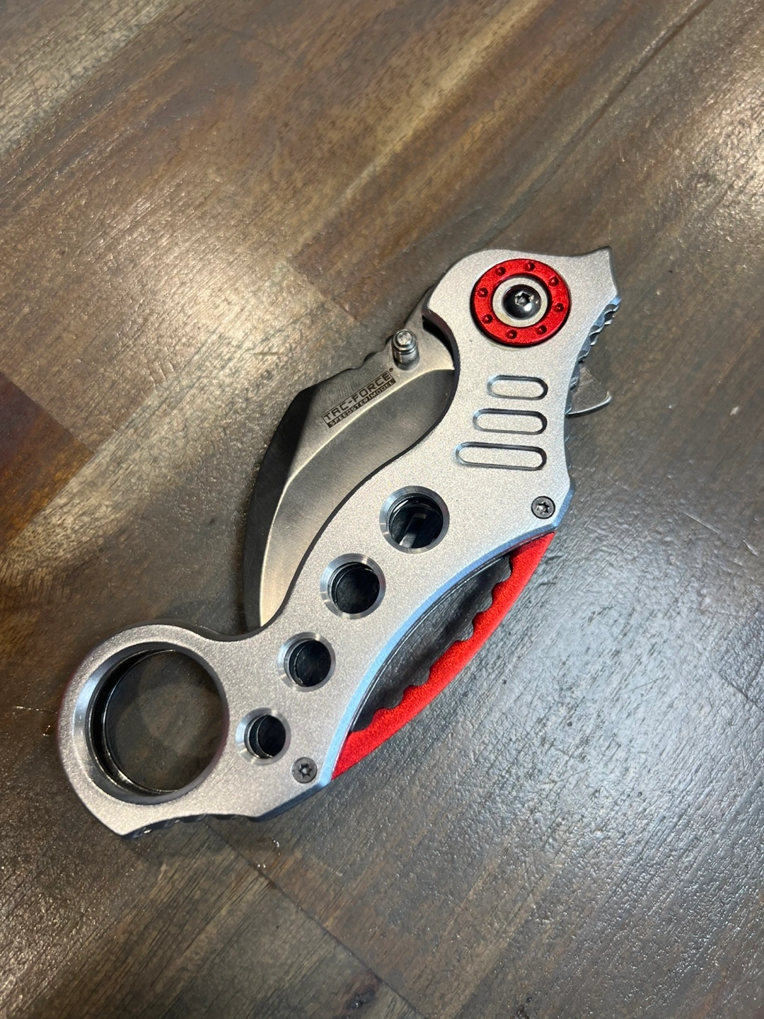 Selling a TAC-FORCE folding knife. The blade is stainless steel and the handle has a unique design with red accents. It's marked as TF-578 and "UBA DESIGN". Valued more than asking price. Open to offers.