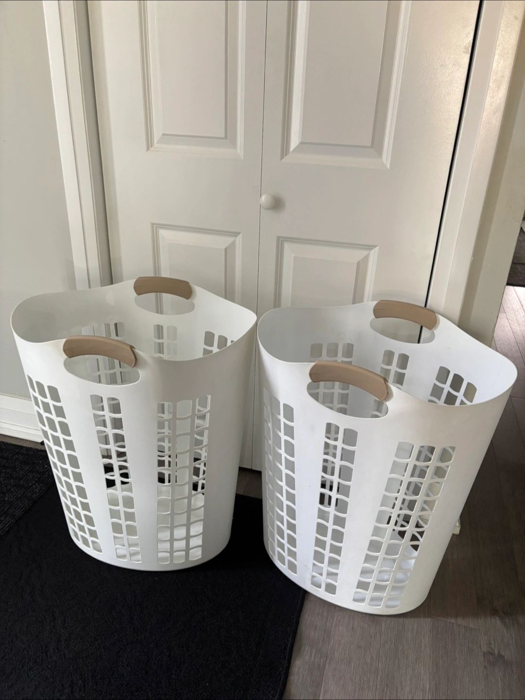 Selling a set of two white plastic laundry baskets. They're in great shape and ready to help with your laundry needs!