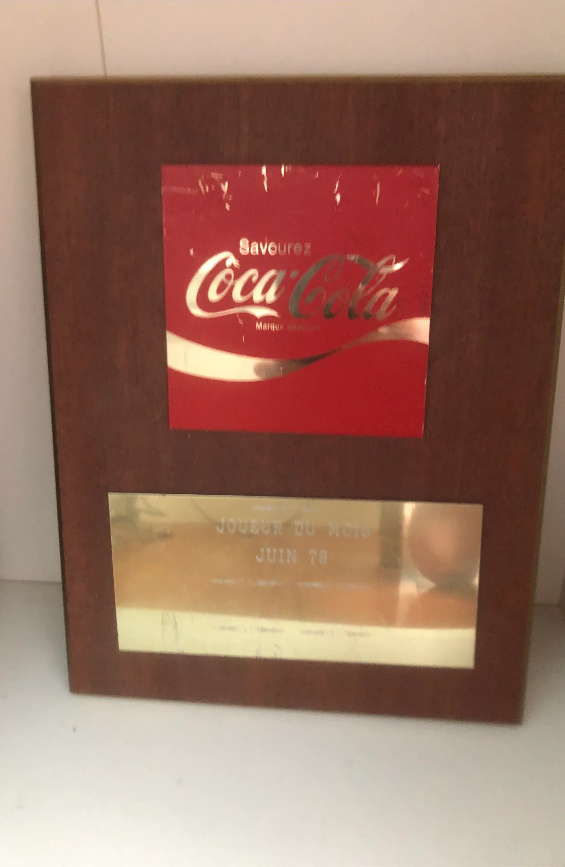Selling a vintage Coca-Cola plaque featuring the words "Joueur du Mois Juin 78". This unique piece would be a great addition to any collection or as a decorative item for a Coca-Cola enthusiast's space
