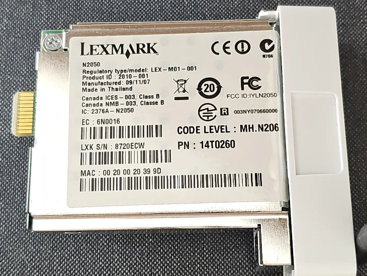 Selling a Lexmark N2050 network card. It's marked with regulatory type/model LEX-M01-001 and product ID 2010-001. It was manufactured on 2007 November 09 in Thailand. The FCC ID is IYLN2050. The code level is MH.N206 and the part number is 14T0260