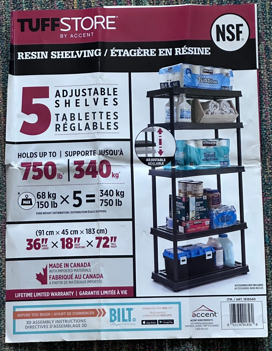Selling a TuffStore by Accent resin shelving unit with 5 adjustable shelves! It can hold up to 750 lbs (340 kg). The dimensions are 36" wide x 18" deep x 72" tall. It's in great shape and ready for a new home.