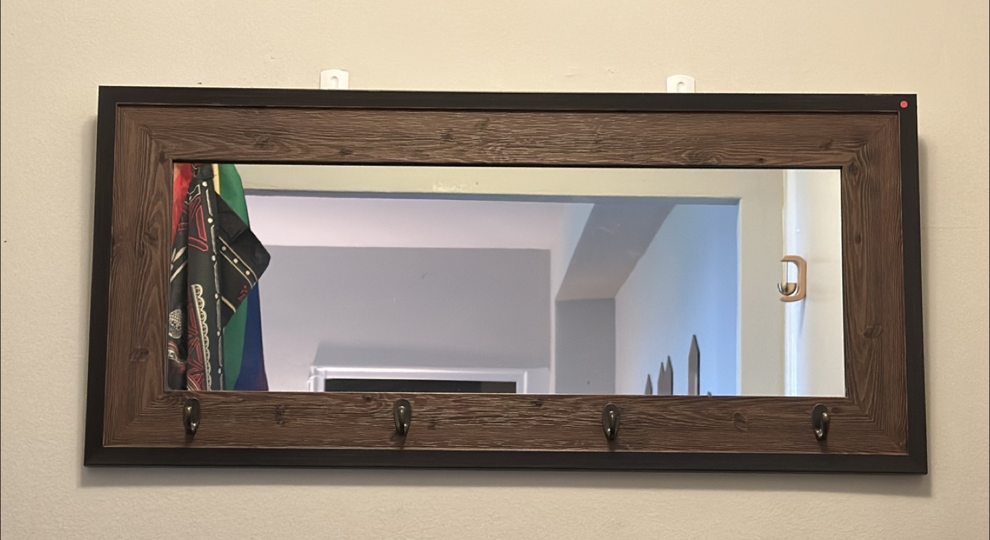 This is a wall mirror with a brown wood frame and metal hooks. It's perfect for an entryway or hallway to hang your coats and scarves. The mirror is in good condition and ready to add a touch of rustic charm to your home!