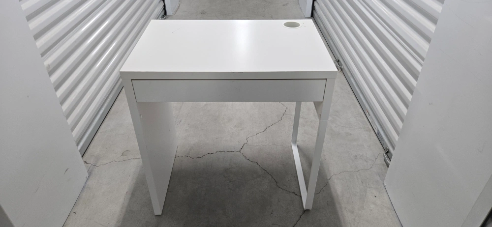 Selling a simple white desk that's perfect for a small space or home office! It features a clean design with a convenient drawer for storage. It has a hole for cable management as well. Cosmetic scratches.