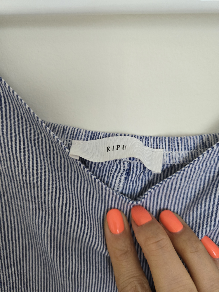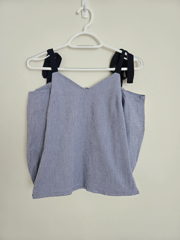Off shoulder top with blue and white striped pattern with navy blue ribbon straps. It's a size small and in great condition!