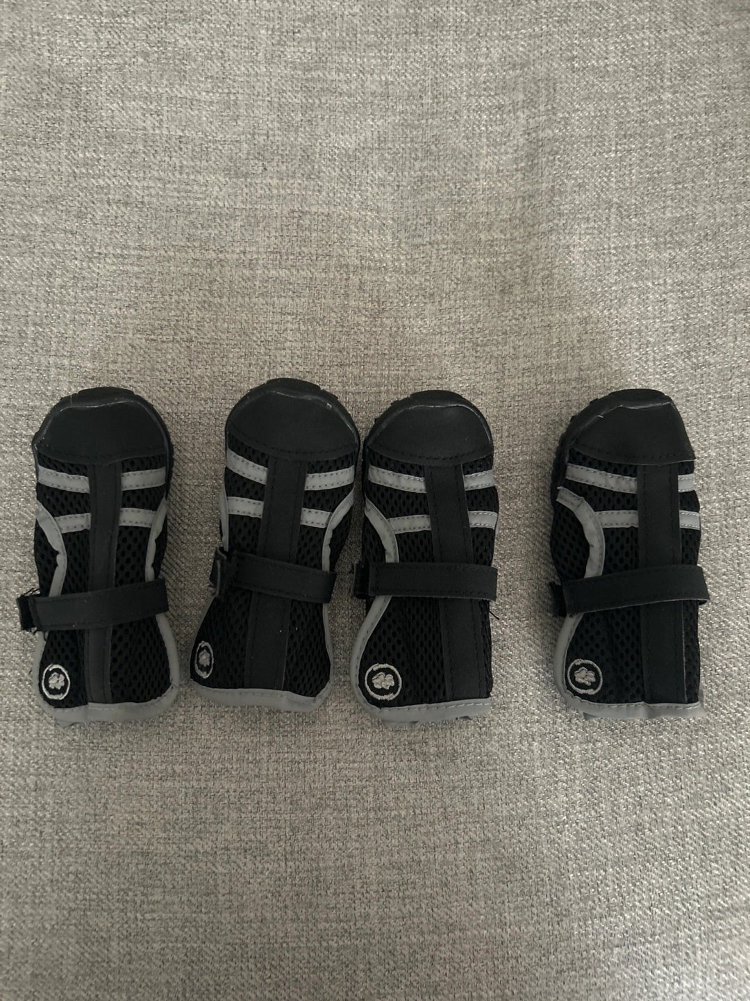 Selling a set of 4 dog boots! They are black with reflective stripes and have a velcro strap for easy fastening. The soles have a paw print design for extra grip. Great for protecting your furry friend's paws on walks!