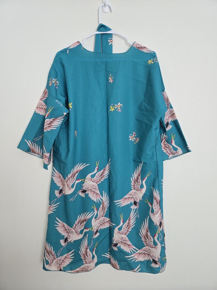 This teal kimono-style dress features a beautiful crane print! It has a tie waist and a relaxed fit, perfect for layering or wearing on its own. New and great and ready for a new home