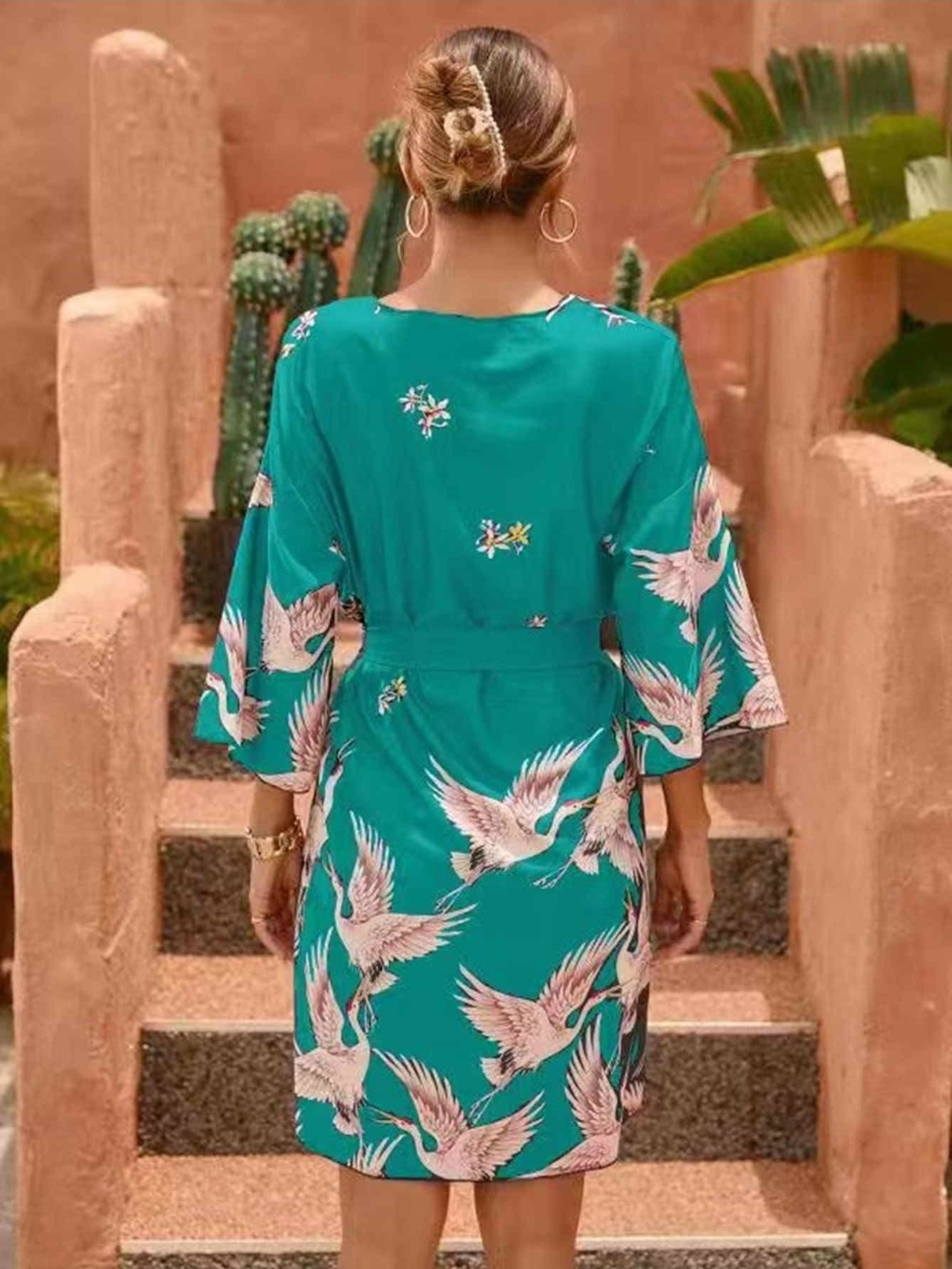 Teal Crane Print Kimono Dress