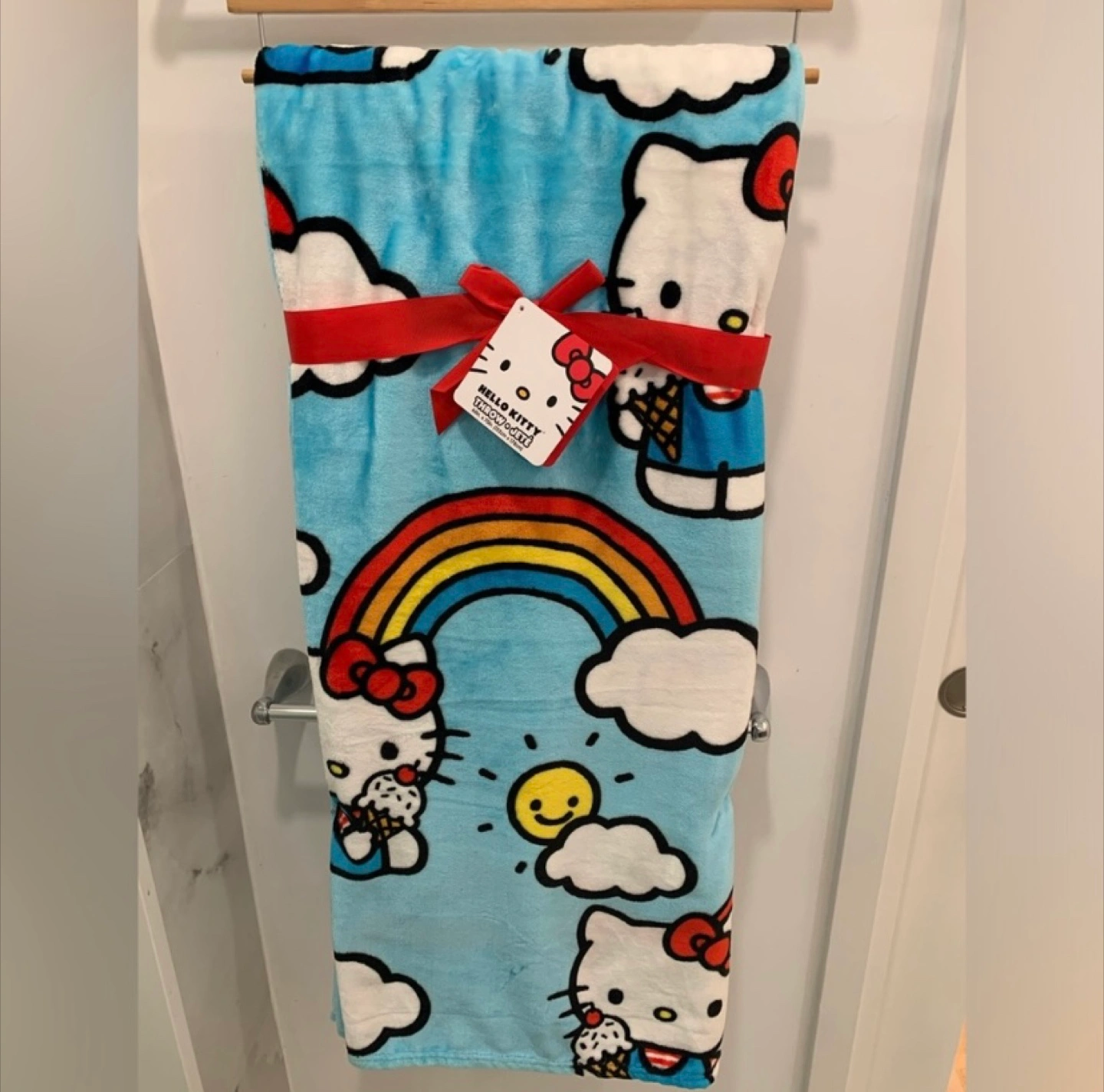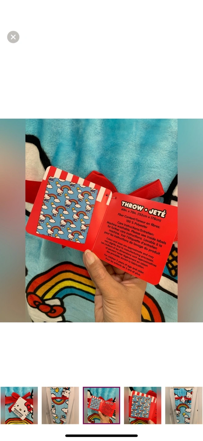 Price is FIRM! I have a brand new Hello Kitty throw blanket for sale! It's super cute with a Hello Kitty and rainbow design on a light blue background.