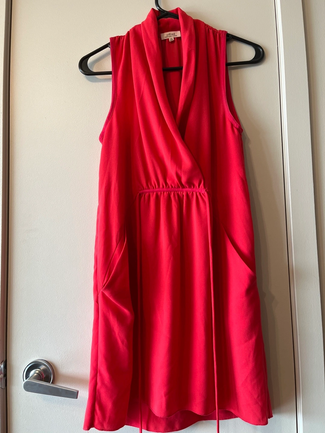 Selling a cute Wilfred Free mini dress in a vibrant red! It's a size XS and features a flattering wrap-style front and handy pockets. Perfect for summer days or dressing up for a night out!