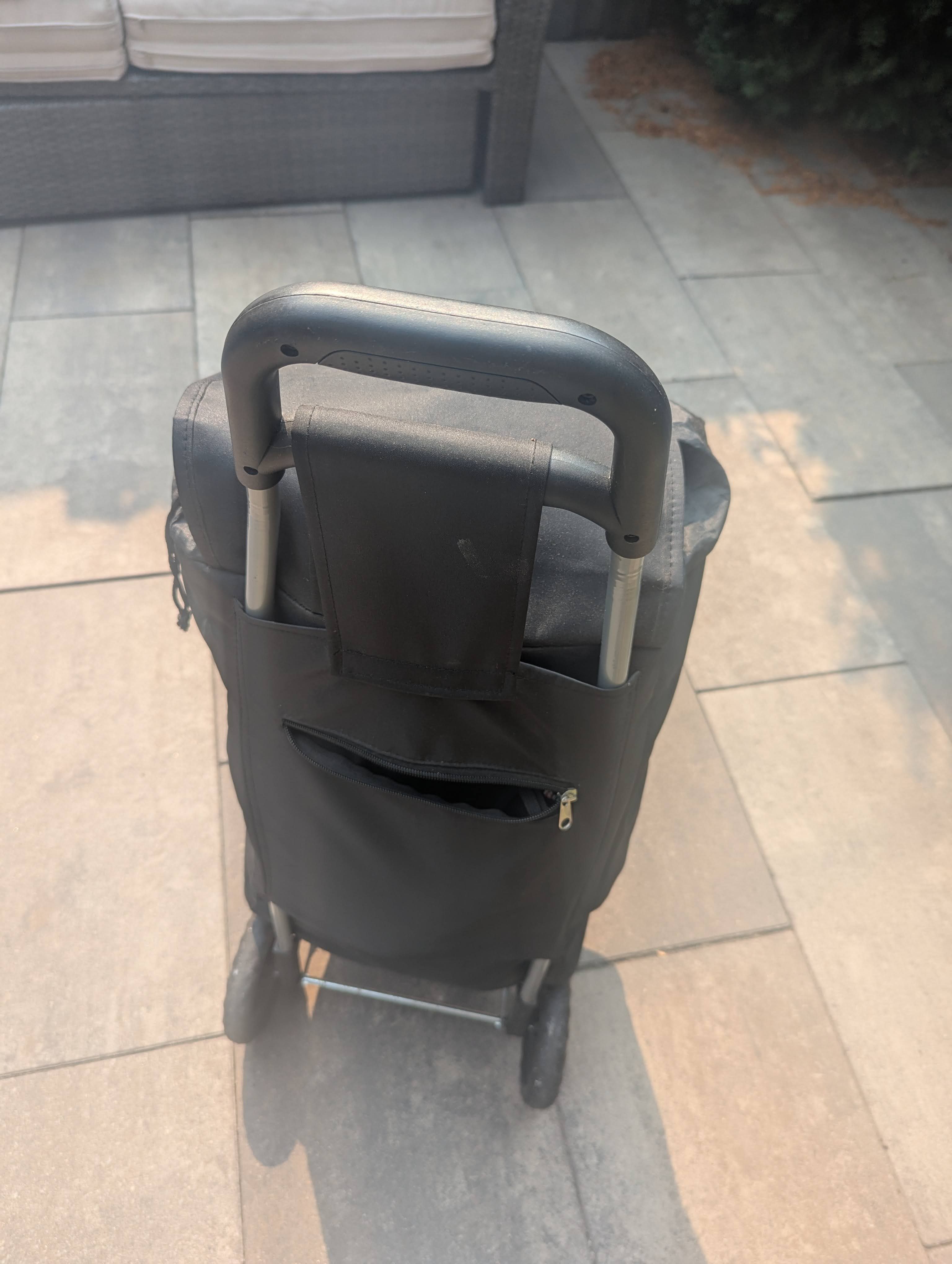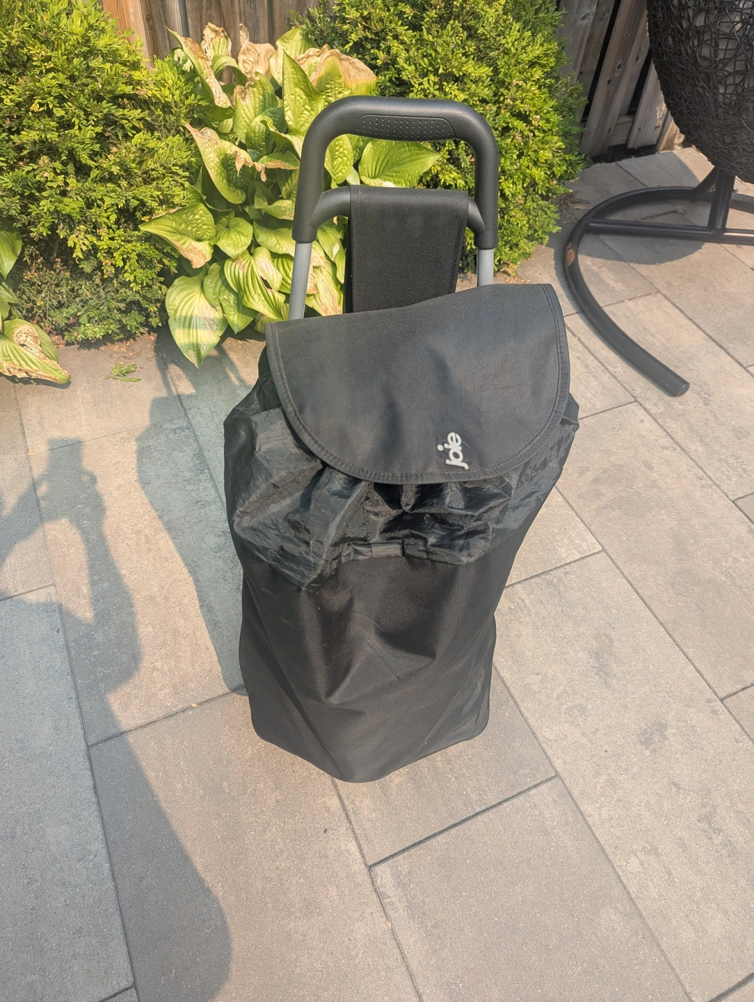 Selling a versatile black rolling shopping cart with a telescoping handle and two wheels. The bag has a unique insulated interior, making it perfect for keeping groceries or drinks cold on your way home. It's a lifesaver for grocery trips, picnics, or laundry. It's in great, clean condition.