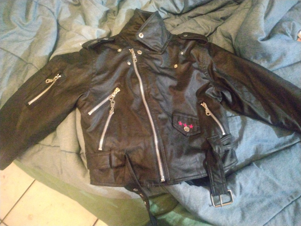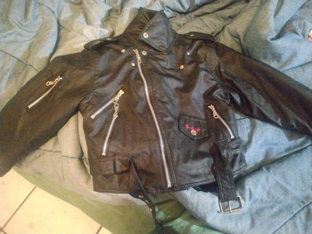 I'm selling a cool black leather jacket from Outdoor Habitat. It's a size 6T and has a stylish design with lots of zippers and even a little belt detail. Perfect for your little one to rock a trendy look!