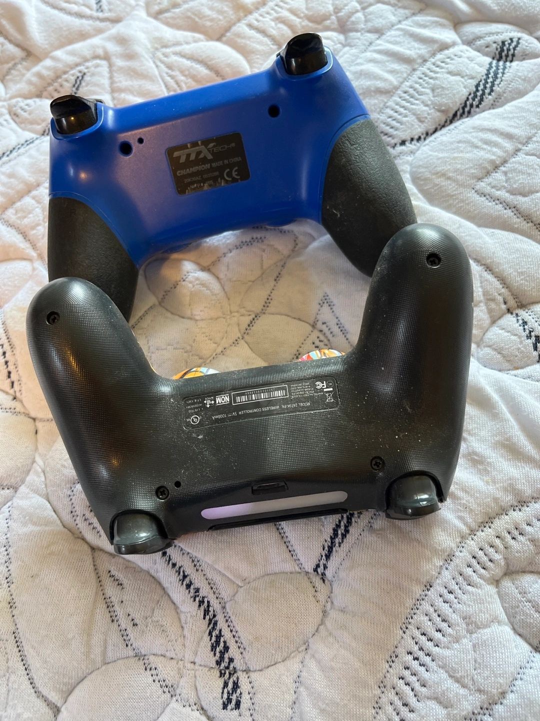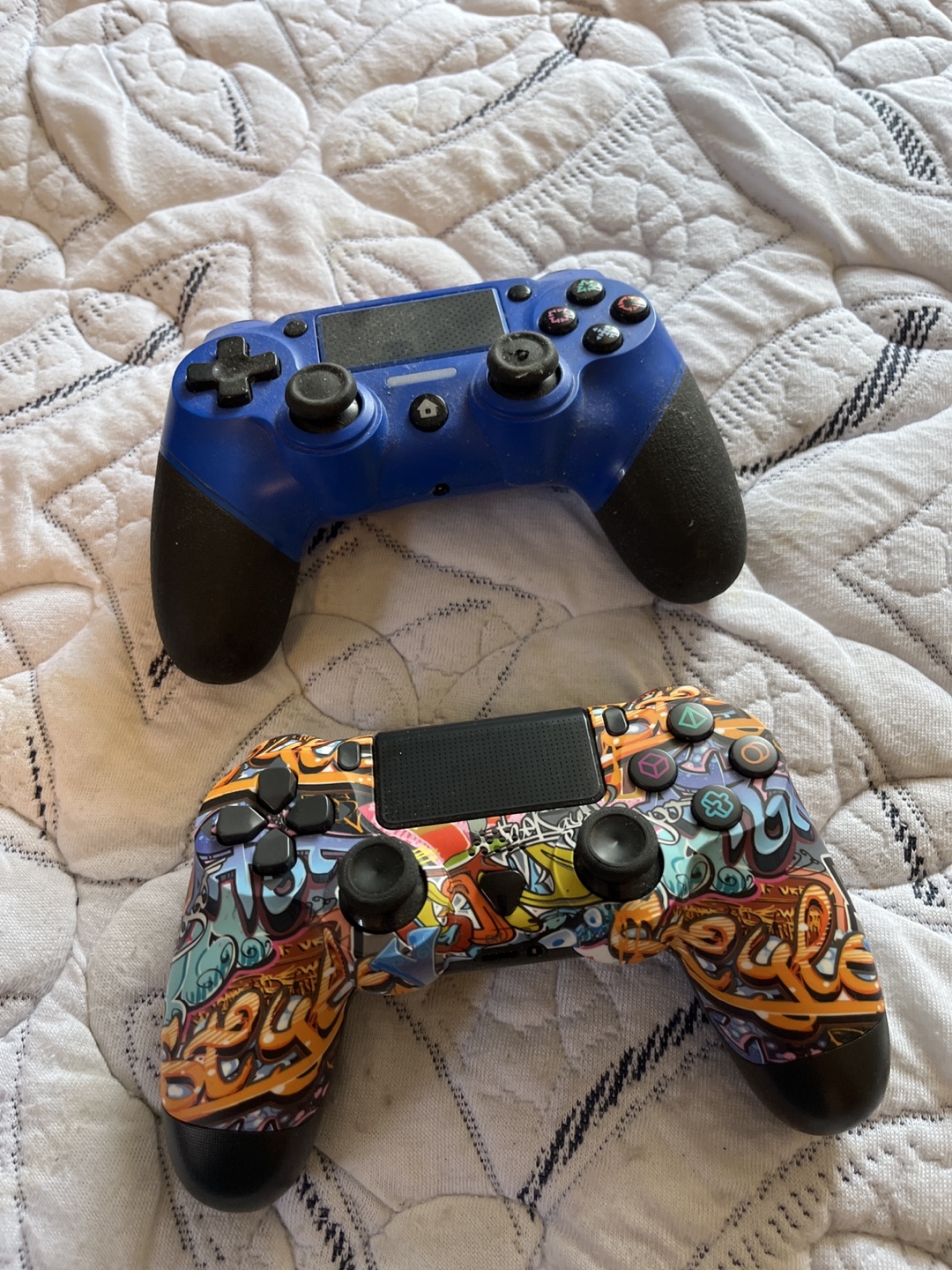 Selling two PlayStation 4 controllers. One is a blue TTX Tech controller and the other is a Champion controller with a graffiti design. Both are used but in good working condition!