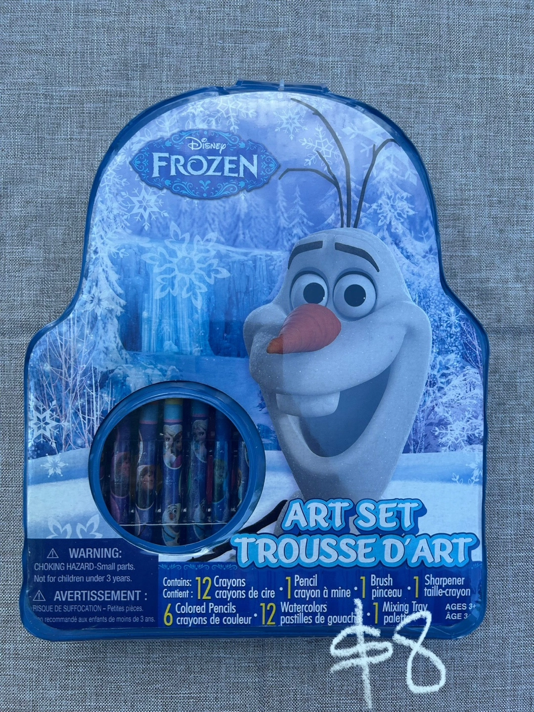 15Get creative with this Disney Frozen art set! It includes: - 12 crayons - 6 coloured pencils - 12 watercolours - 1 paintbrush - 1 pencil sharpener - 1 mixing tray Perfect for ages 3+