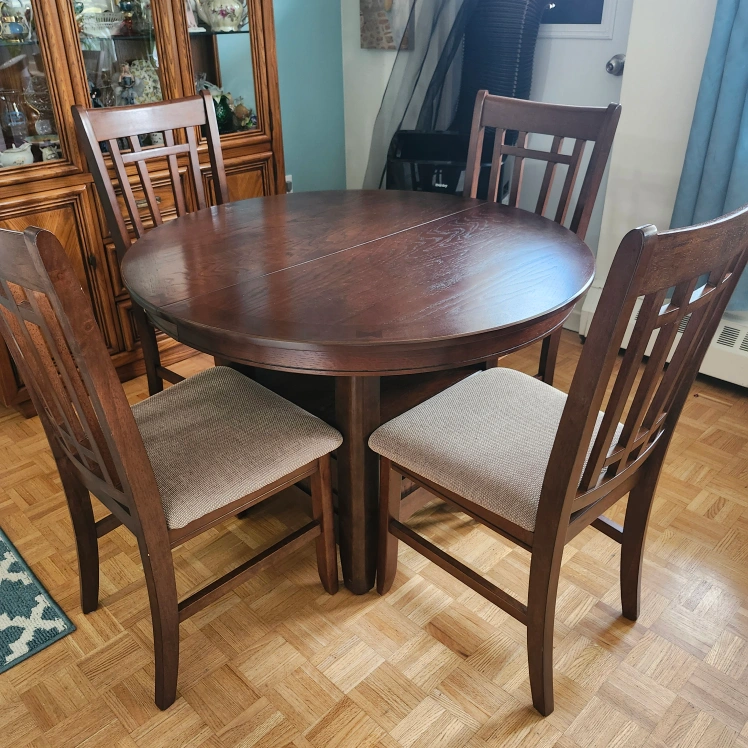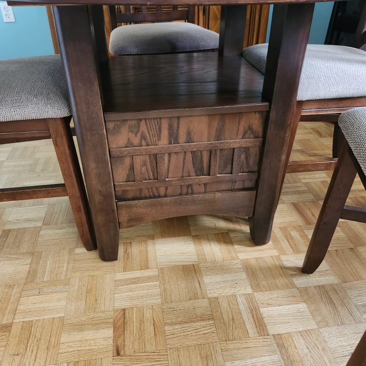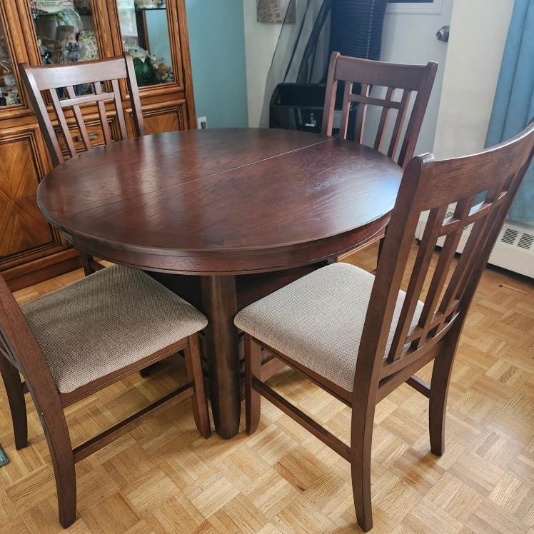 Selling a Counter height dining table(leaf included) .42"diameter...60" when leaf is added,with four matching chairs.The set is made of wood and has a classic design. The chairs have cushioned seats for added comfort. It's in like new condition, hardly ever sat at.Paid over $1300.Ready for a new home! Cash and pick up only...Final price.