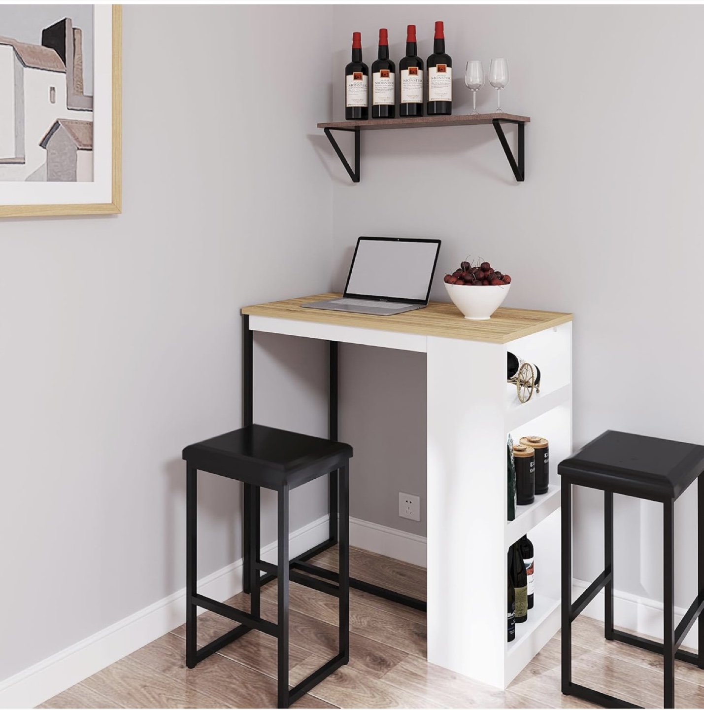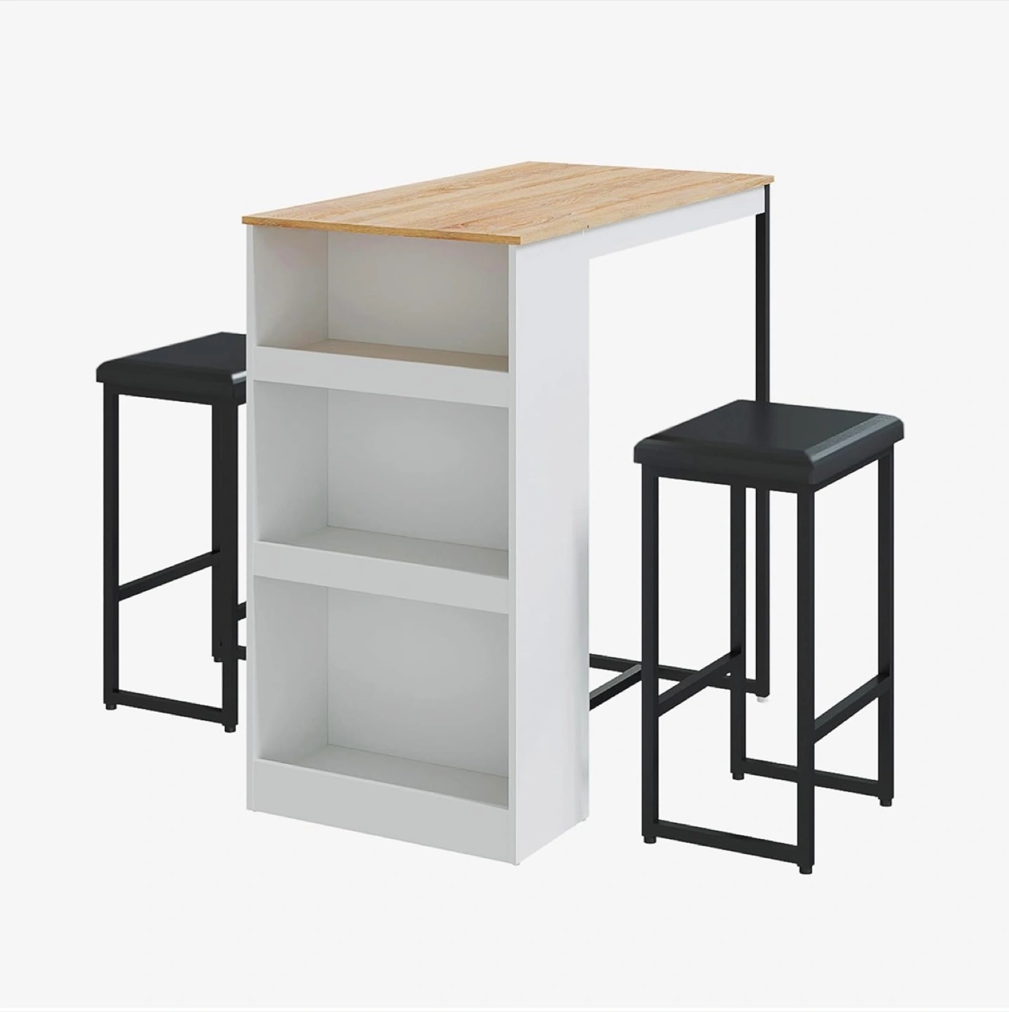 Looking to sell this bar table with two stools! The table has a white frame with a light wood-coloured top and built-in shelves. The stools are black with a metal frame.