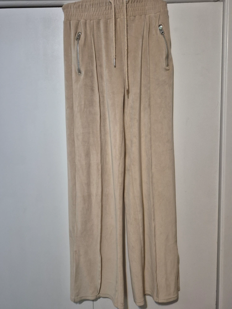 Comfy beige velour wide leg pants with a drawstring waist and zipper pockets. Perfect for lounging around the house or running errands!