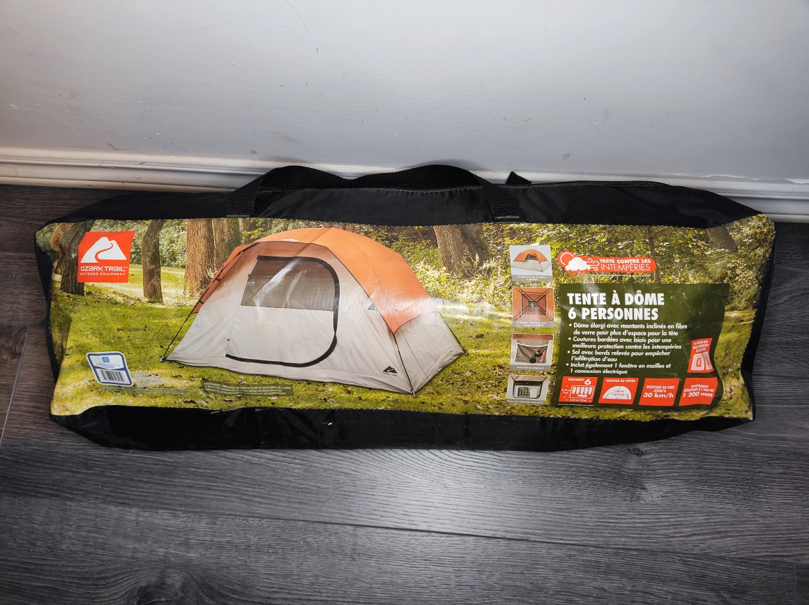Selling an Ozark Trail 6-person dome tent! It comes with its original carry bag for easy storage and transport. This tent is designed to comfortably fit 6 people, making it perfect for family camping trips or outings with friends. It's also designed to withstand winds up to 30 km/h and has a waterproof rating of 200 mm