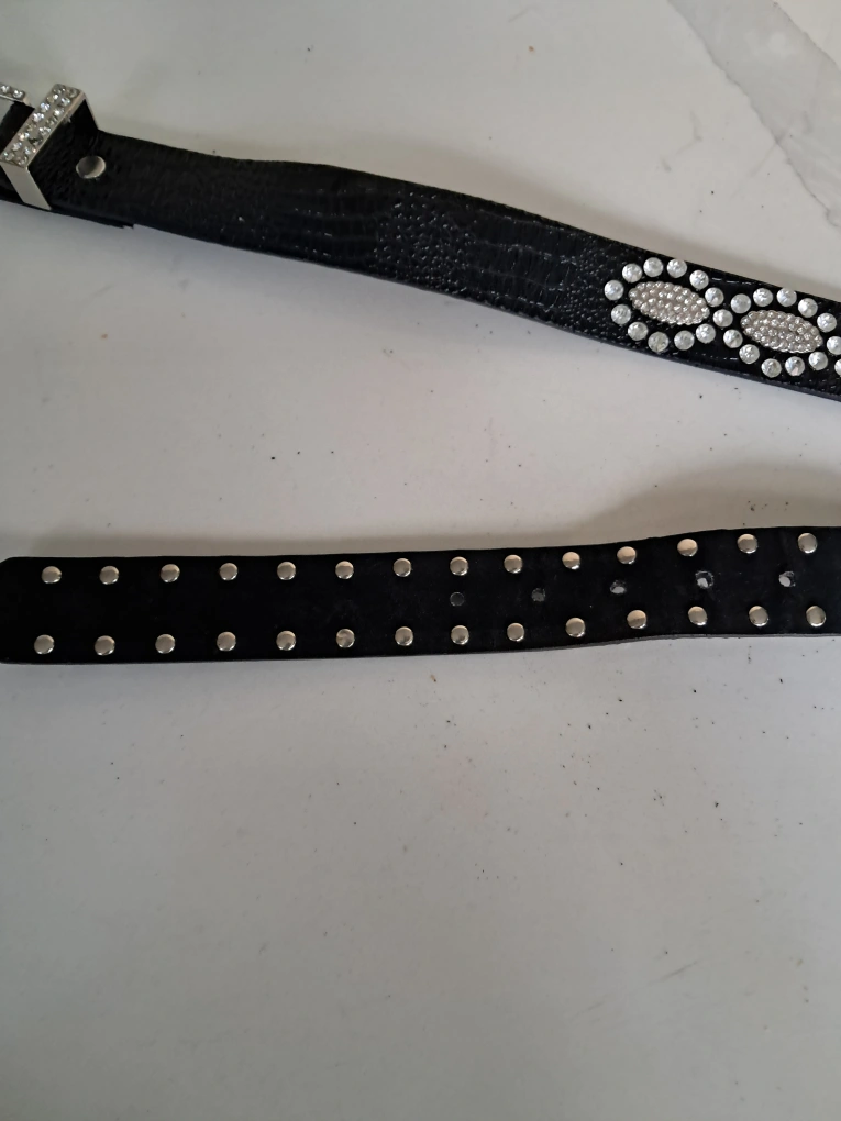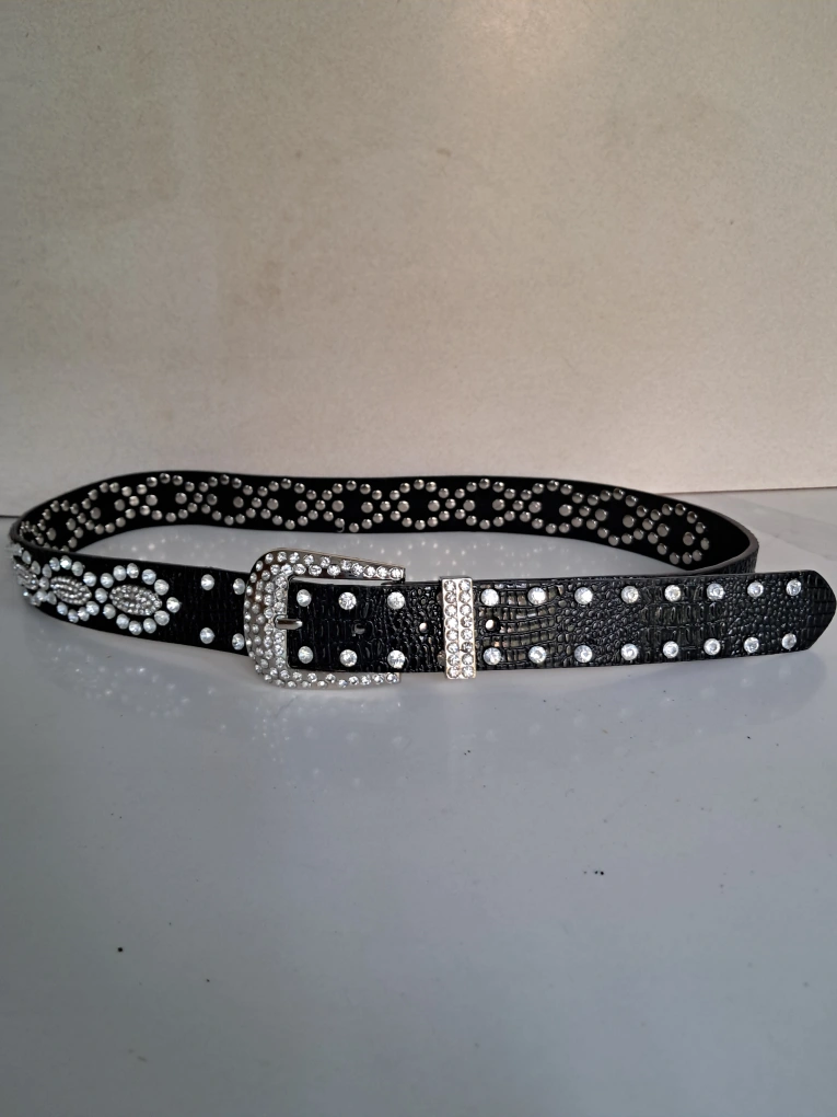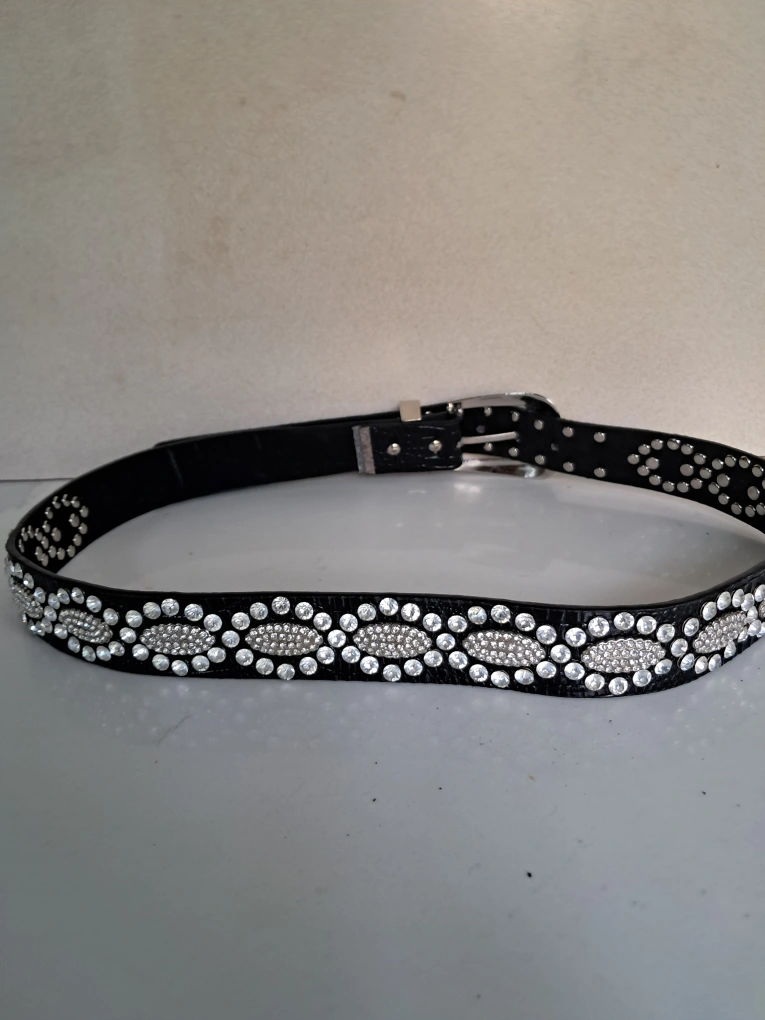 This is a black belt with rhinestone embellishments. It measures approximately 40 inches in length. It's a stylish accessory to add some sparkle to your outfit!