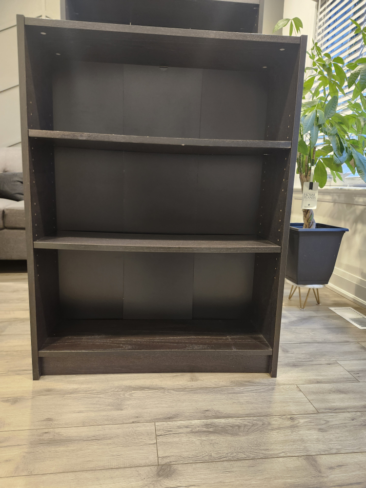 Selling a dark brown bookcase in good condition. It has three shelves and is perfect for storing books or displaying items. A great addition to any room!
