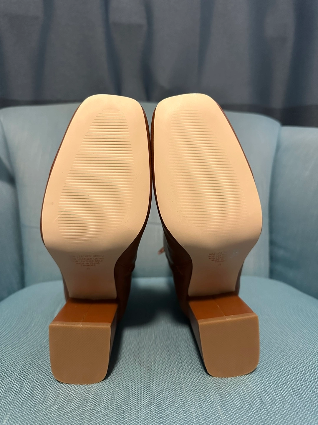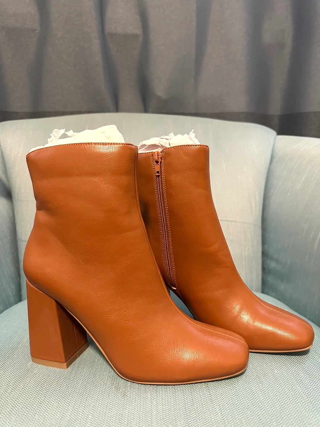 Size: US 8/ EUR 39 Brand: Therapy | Color: Thunder Tan Condition: New, unused no more box With soft lining and Foam Cushion Block Heel Height: 3.5” or 9cm Inside Zip for ease of wear With vey minor barely noticeable scratch due to storage. See last pic.