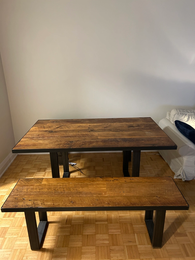 Selling a Custom made rustic dining table with 2 matching benches. The table and benches are made from reclaimed wood, giving them a unique and charming look. Great for adding a touch of warmth to your dining space. The wood has a beautiful grain and texture, and the metal legs provide a sturdy base.