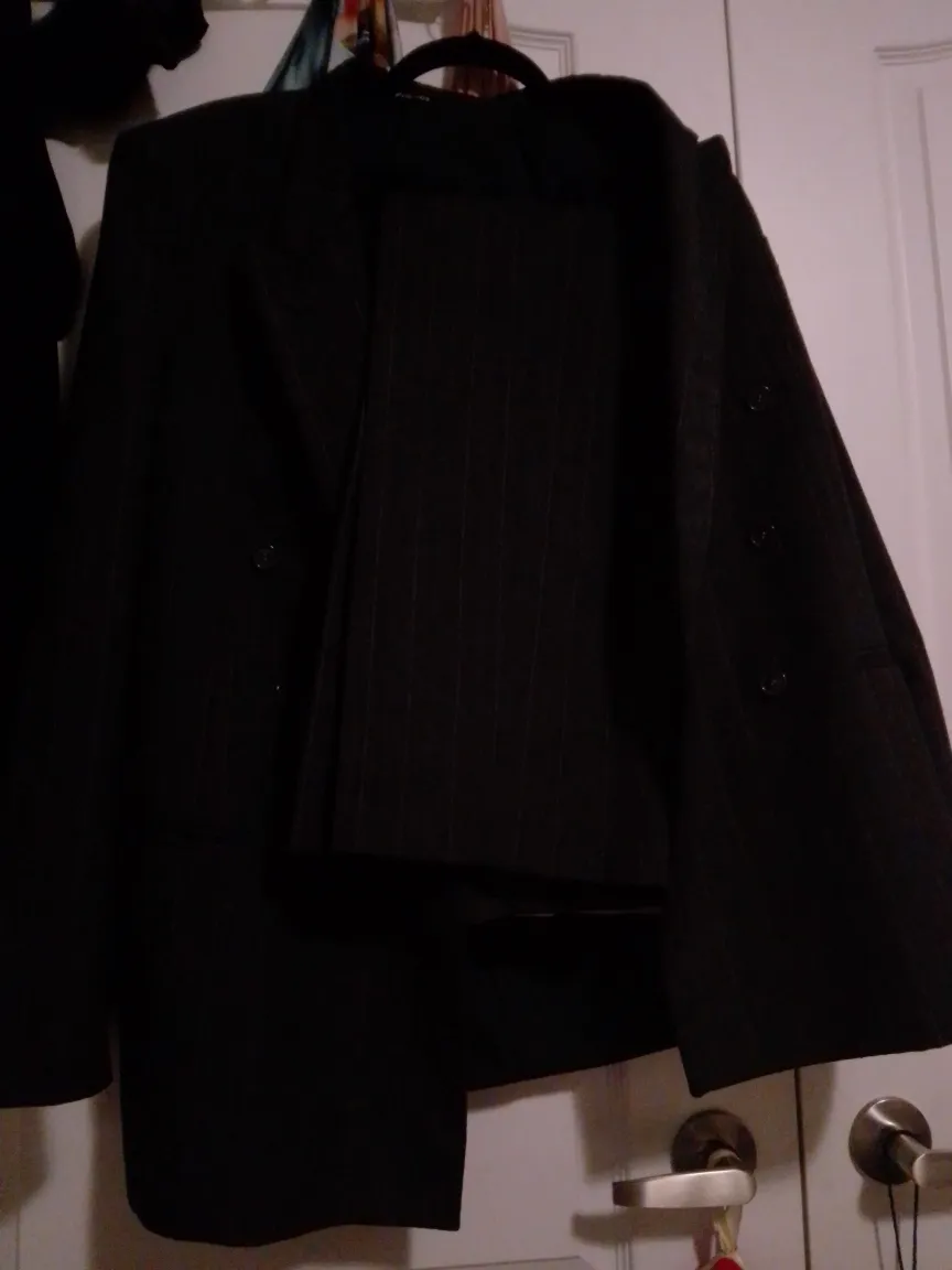 Selling a men's pinstripe suit. It's in good condition and ready for a new home! Perfect for work or special occasions