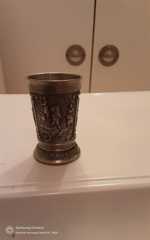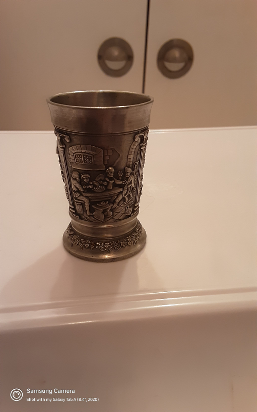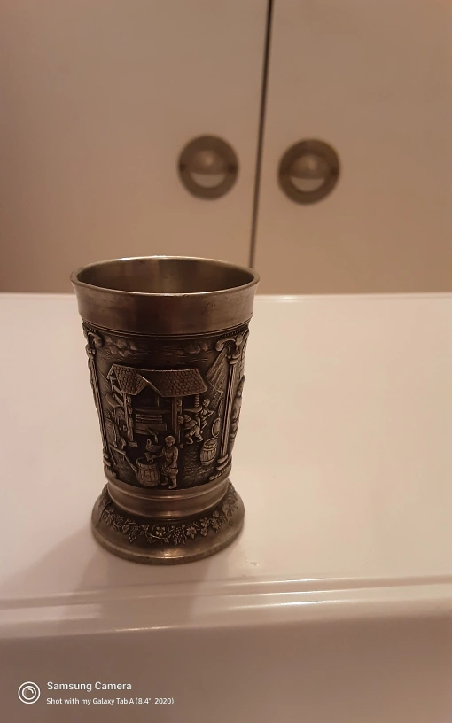 Selling a vintage pewter shot glass. It has detailed engravings of people and buildings. A unique piece for collectors or anyone who appreciates vintage items