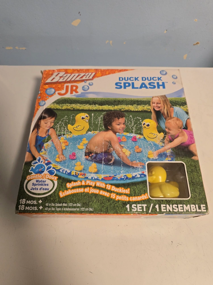 Brand new in box, never opened. Banzai Jr Duck duck splash. Garden hose attaches for summer fun. Says for kids 18 months and older.
