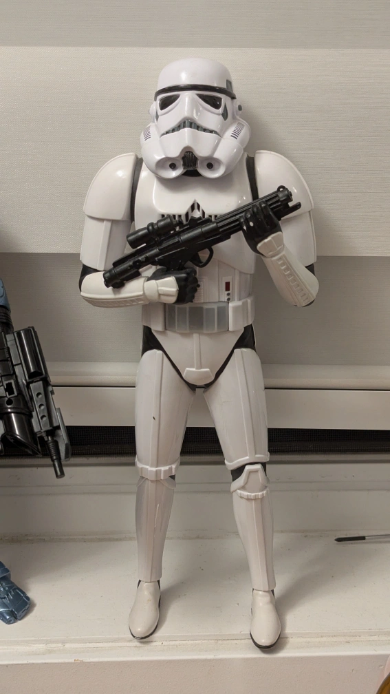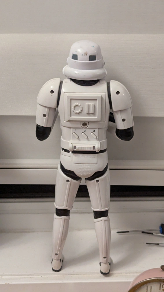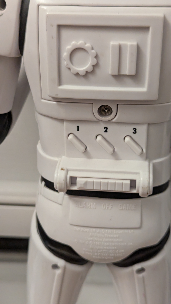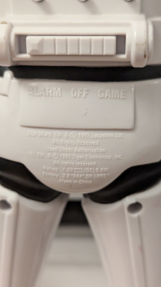 Selling a vintage Star Wars Stormtrooper figure from 1997 by from Licasfilm! It has an alarm and game function. Motion sensor activates "Move along". Another little orange shooter that works with the target mode is not included. Makes 3 different sounds. Move along, Blaster, It's them Blast em. A cool piece for any Star Wars collector! Batteries included