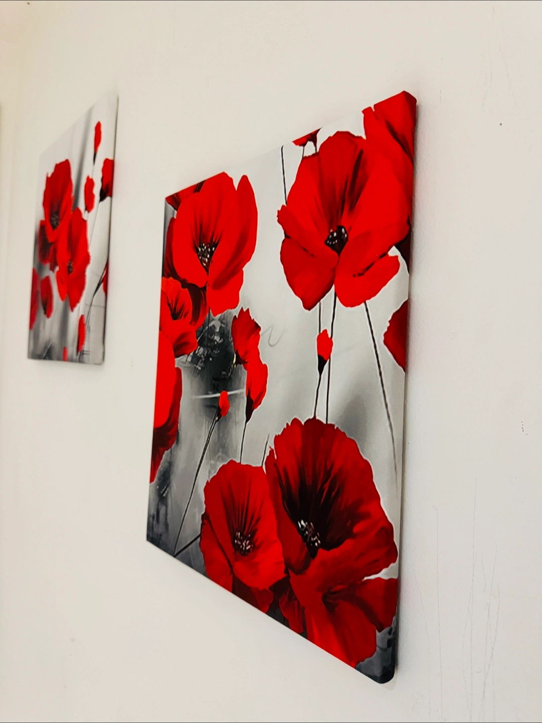 Selling a set of two canvas wall art pieces featuring vibrant red poppies on a grey and white background. They're in great condition and would add a pop of colour to any room!