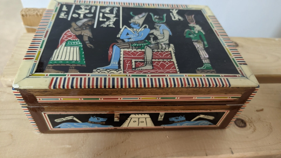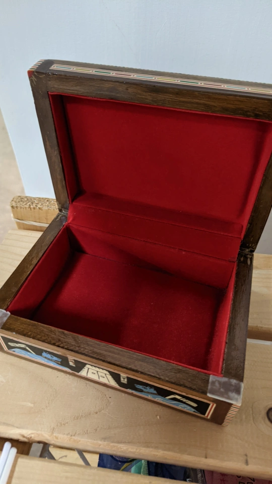 Wooden trinket box from Egypt lined with red felt. Perfect for storing small items or as a decorative piece!