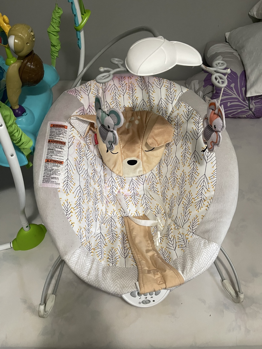 Selling a gently used Fisher-Price baby bouncer. It's in great shape and ready for a new little one! Features a cute deer design and hanging toys to keep your baby entertained. Perfect for soothing and playtime