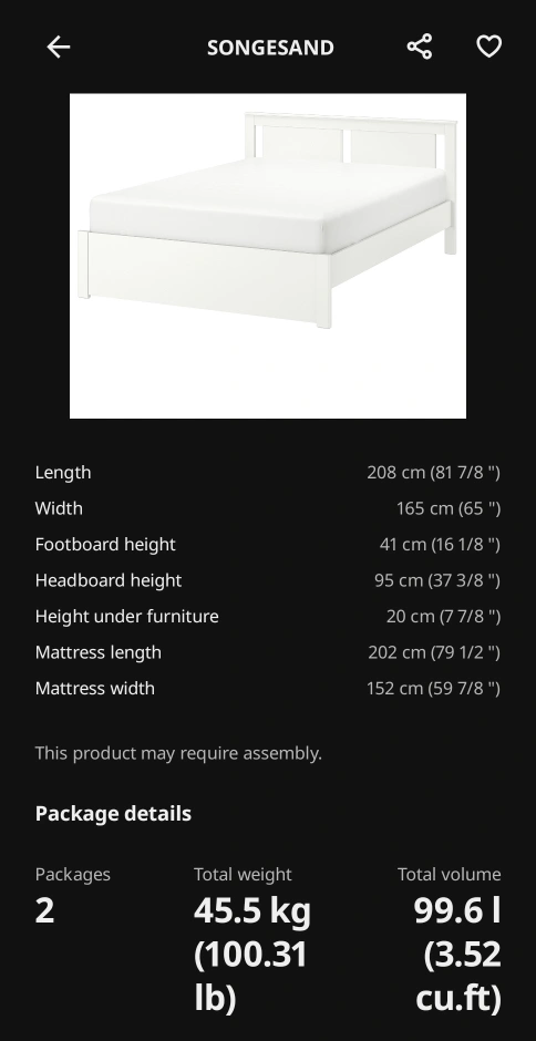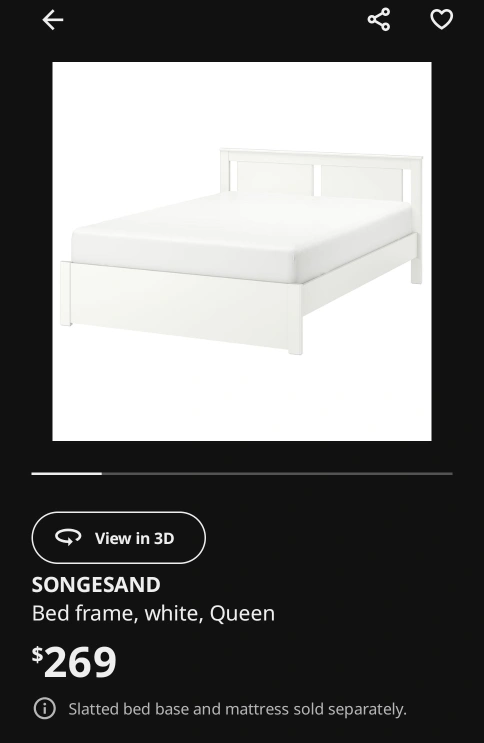 Selling an IKEA Songesand bed frame in white, queen size. It's in great condition and ready for a new home! The dimensions are: