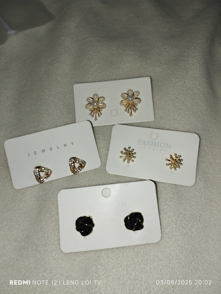 Selling a set of cute fashion earrings, all new on their original cards! There's a variety of styles to choose from, including flower, triangle, starburst, and rose designs. Perfect for adding a little sparkle to your day!