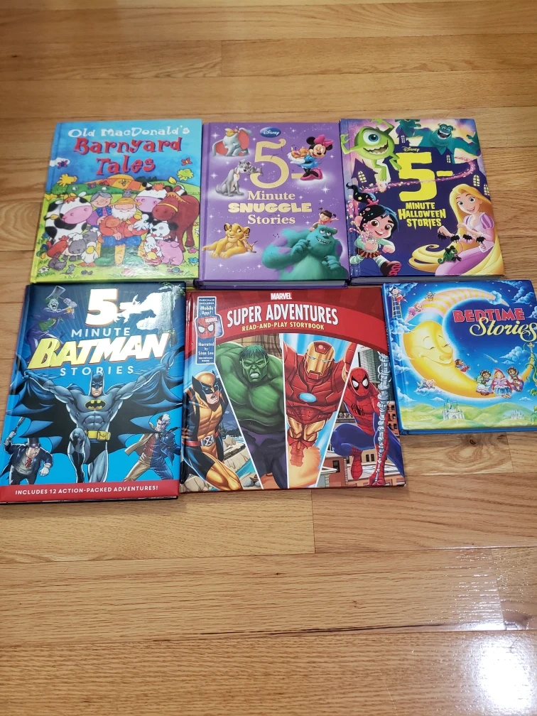 Selling a bundle of kids story books! Includes: - Old MacDonald's Barnyard Tales - Disney 5 Minute Snuggle Stories - 5 Minute Halloween Stories - 5 Minute Batman Stories - Marvel Super Adventures Read-and-Play Storybook - Bedtime Stories