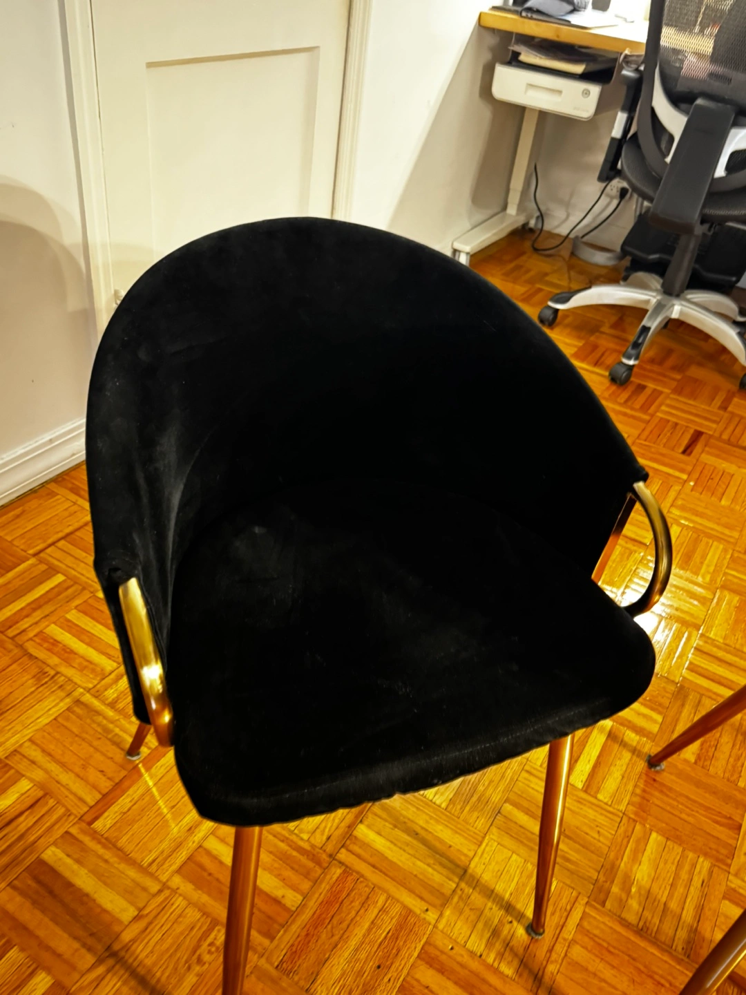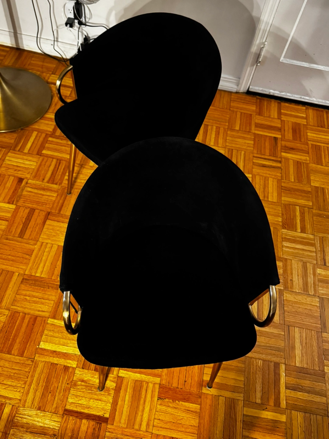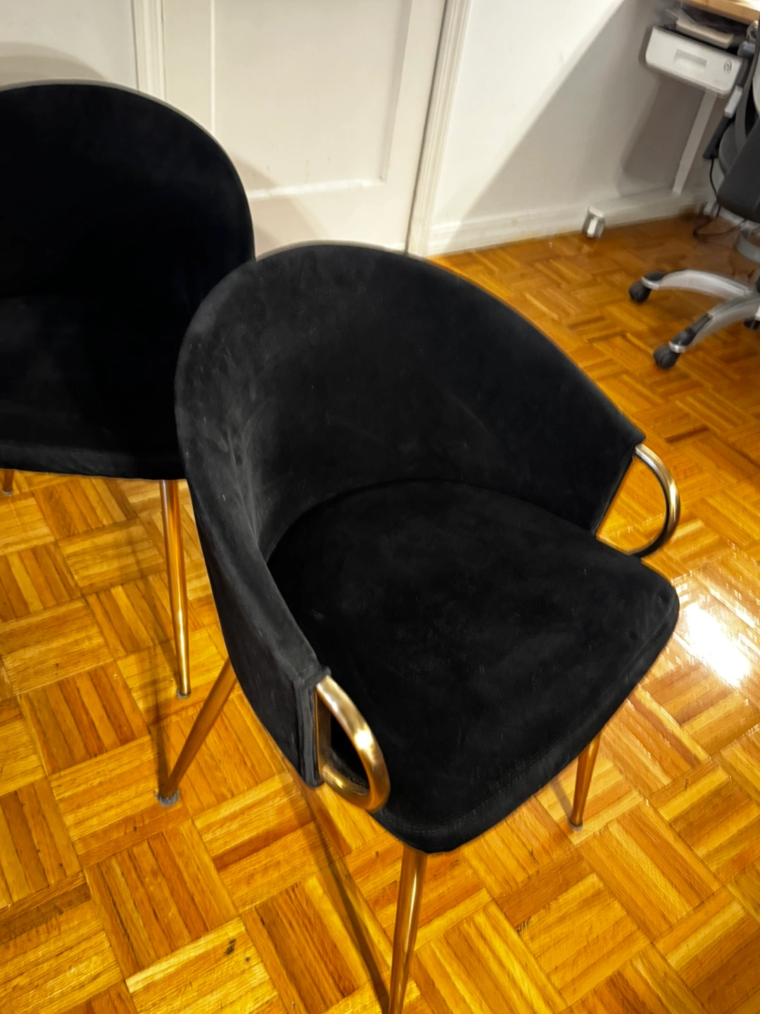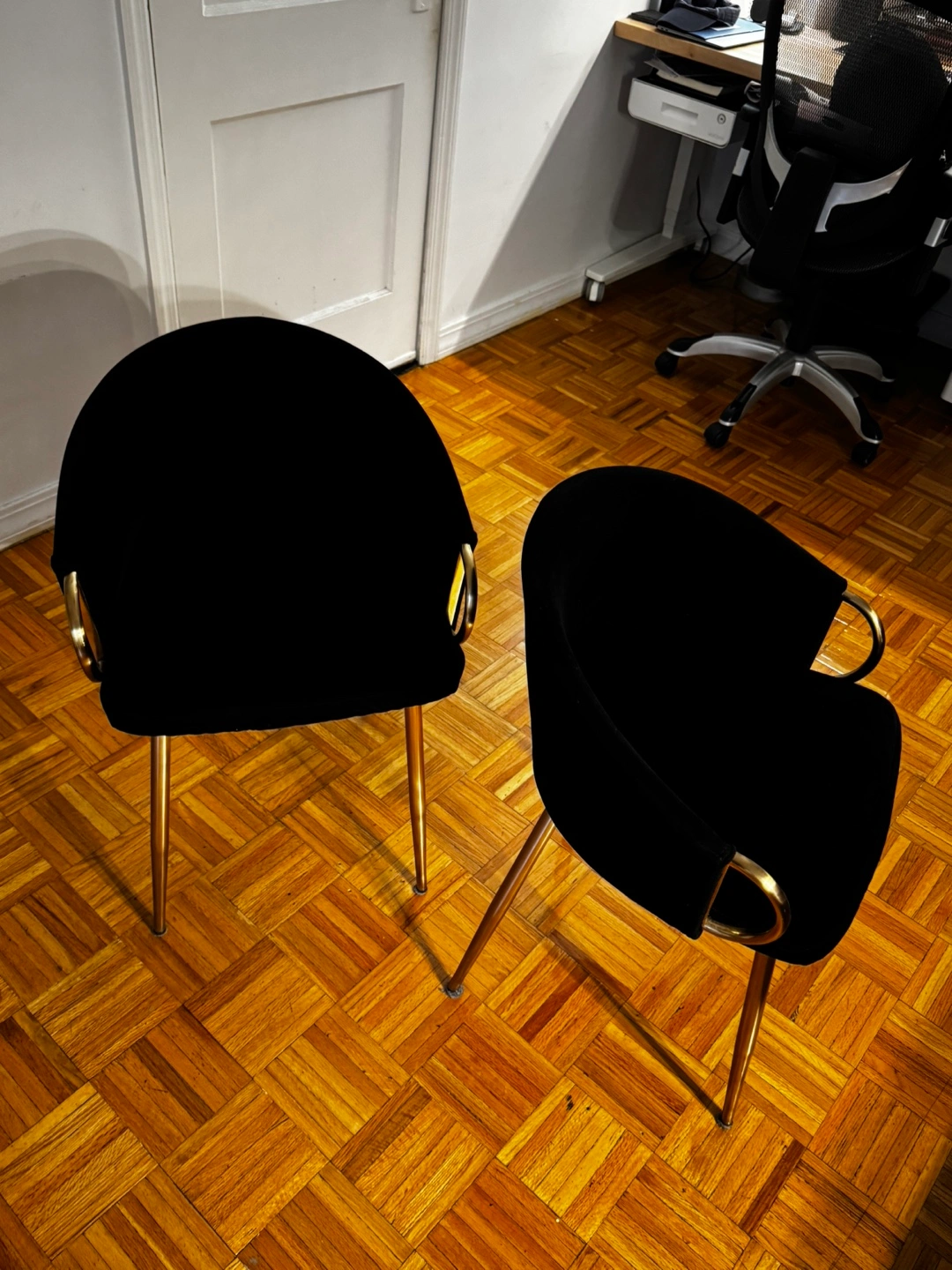 Selling a set of two stylish dining chairs! They feature a sleek black velvet upholstery and eye-catching gold-tone metal legs. These chairs would be a great addition to any dining room or living space