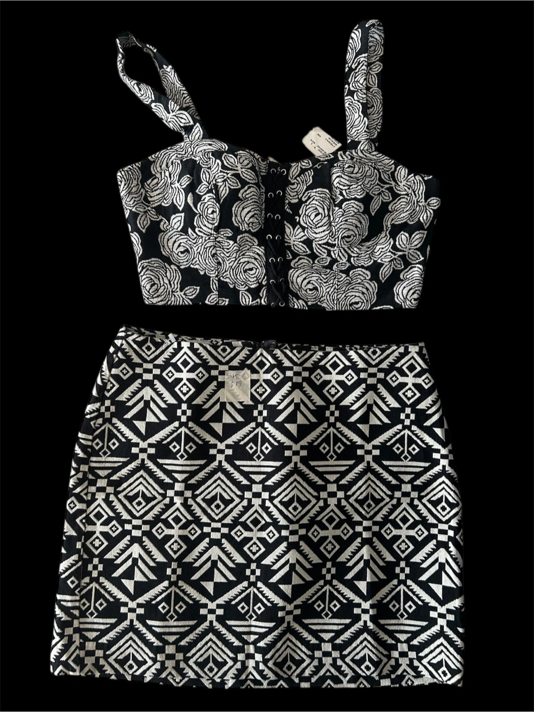 Selling this cute black and white two-piece set! The top is a bustier style with a floral pattern and lace-up detailing. The skirt is a mini skirt with a geometric print. Perfect for a night out or a fun event