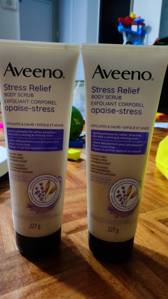 Selling two tubes of Aveeno Stress Relief Body Scrub! This scrub gently exfoliates for softer, smoother skin with a calming lavender scent. It's sulfate and paraben-free, and contains natural PHA. It's completely new. Unopened.